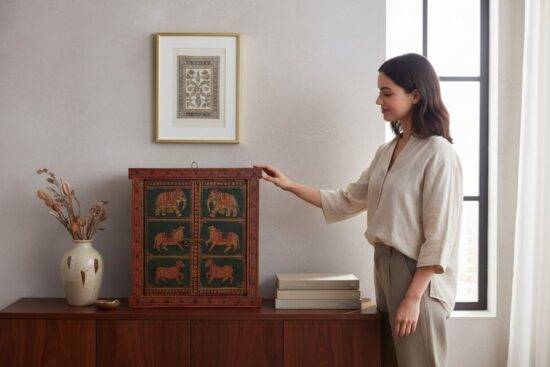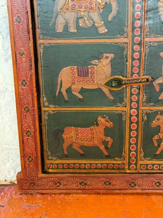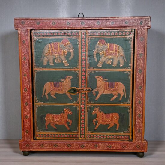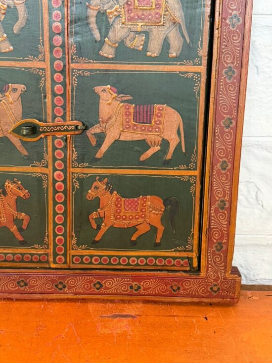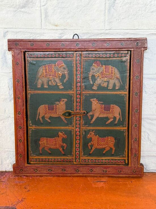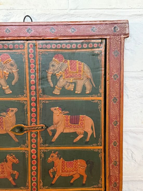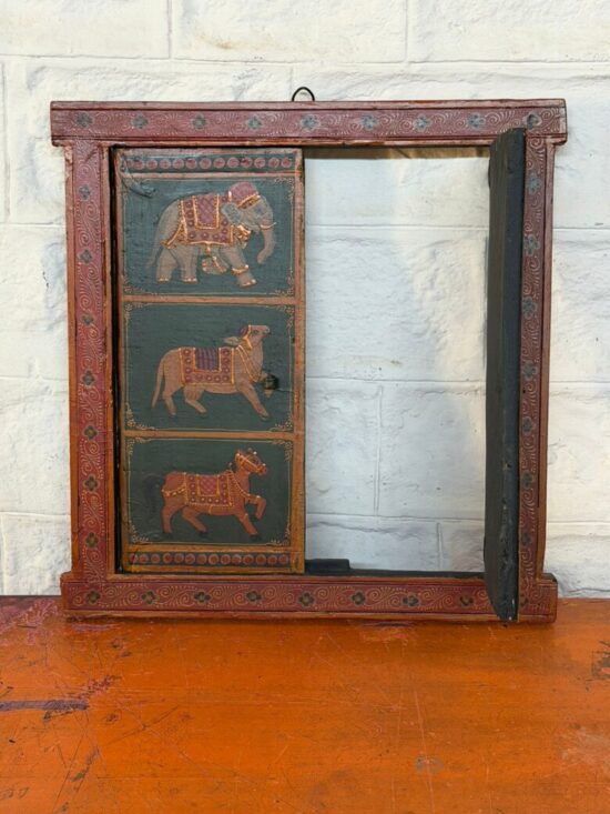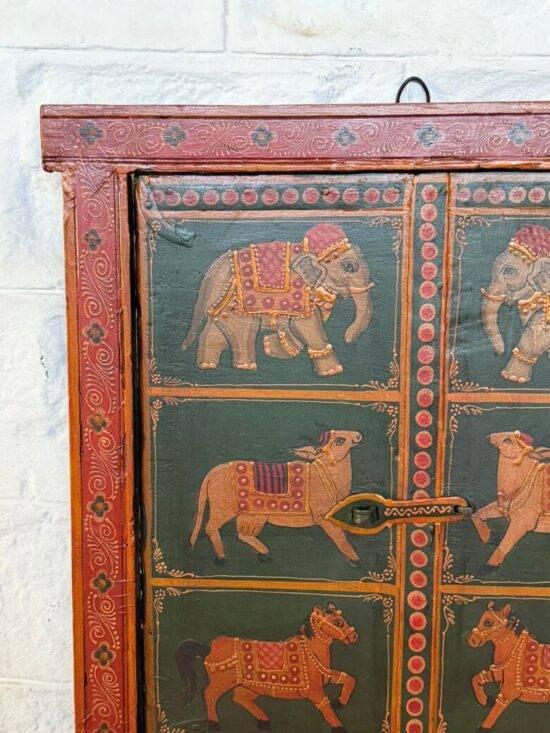 This stunning vintage Indian window panel is an authentic example of hand-painted folk art on solid teak wood, originating from India. Featuring beautifully detailed elephants, cows, and horses, the artwork reflects traditional Indian symbolism of strength, prosperity, and protection.
