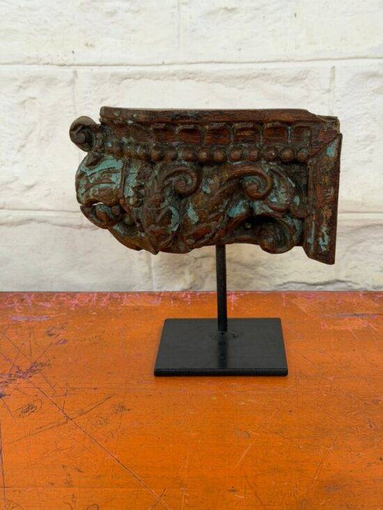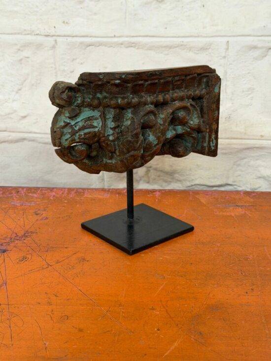 Now mounted elegantly on a custom black iron stand, the Kairavi Pillar Fragment has been thoughtfully preserved as a decorative sculpture, celebrating heritage while blending beautifully into contemporary and eclectic spaces. It works wonderfully as a standalone accent on a console, bookshelf, or mantel, or as part of a curated collection of vintage and antique curios.