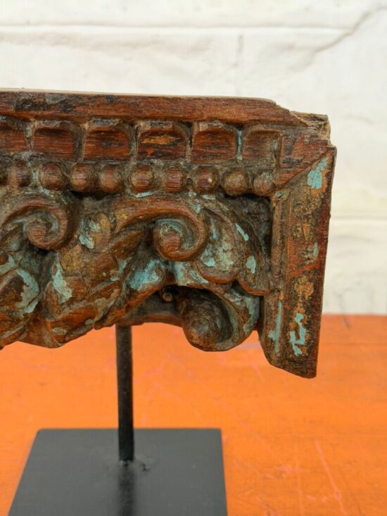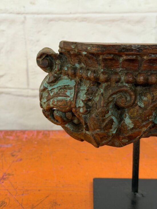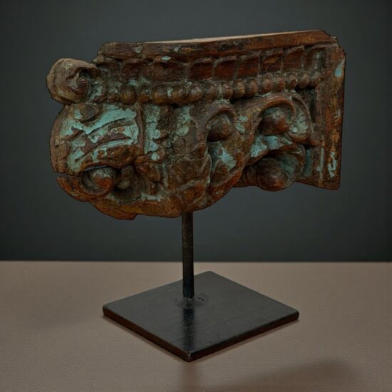 Bring home a piece of architectural history with the Antique Pillar Fragment on Stand—a sculptural wooden artifact that once stood proudly as part of a grand traditional pillar in an old haveli or temple in India. Hand-carved over 80 years ago from solid teak wood, this piece showcases the masterful craftsmanship of a bygone era, where even structural elements were treated as works of art.