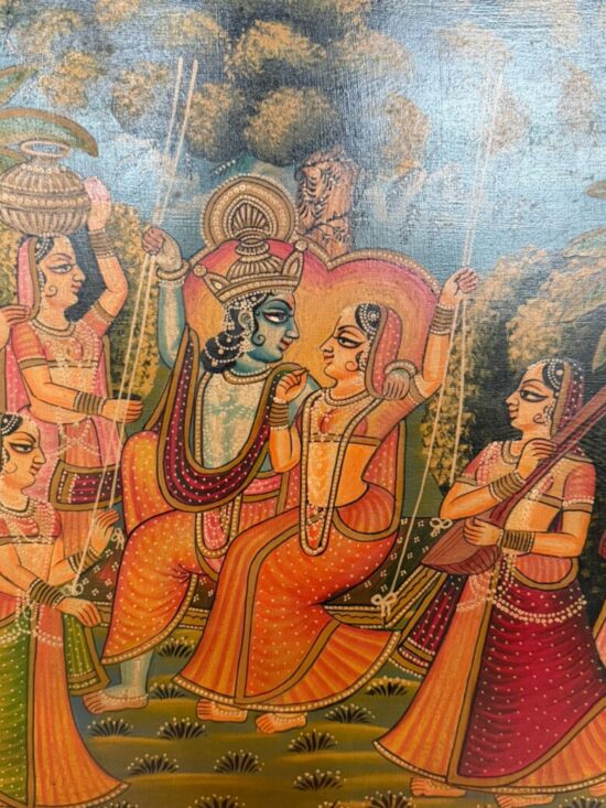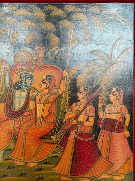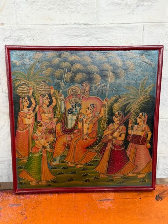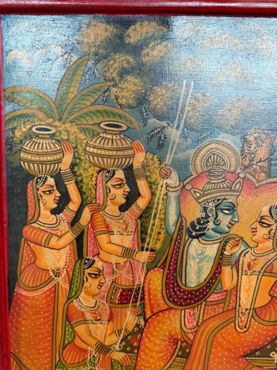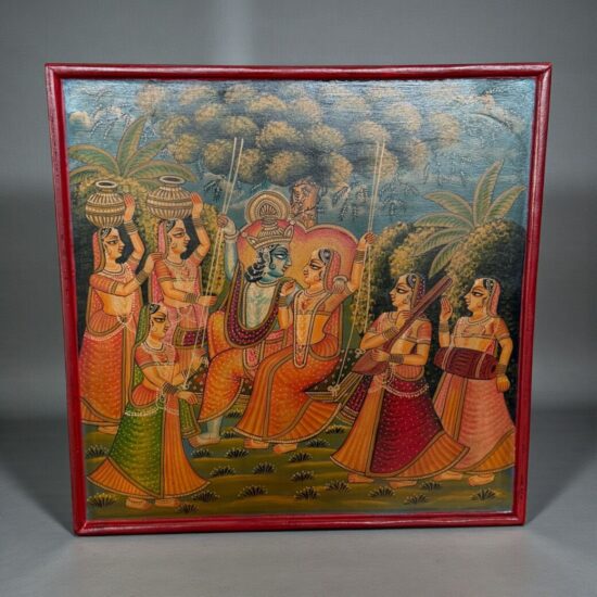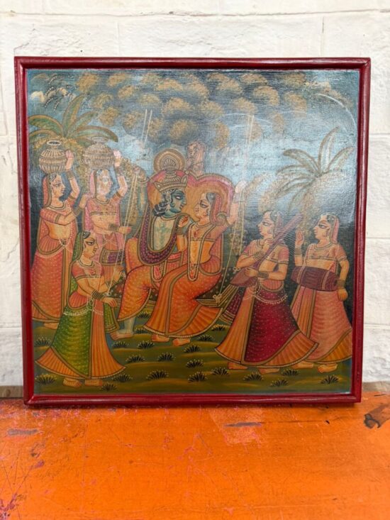 An exquisite antique hand-painted wooden panel depicting a traditional Indian mythological scene, likely inspired by Krishna Leela themes. The composition features richly dressed figures in vibrant attire, surrounded by attendants and musicians, painted in classic Indian folk style.