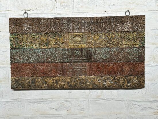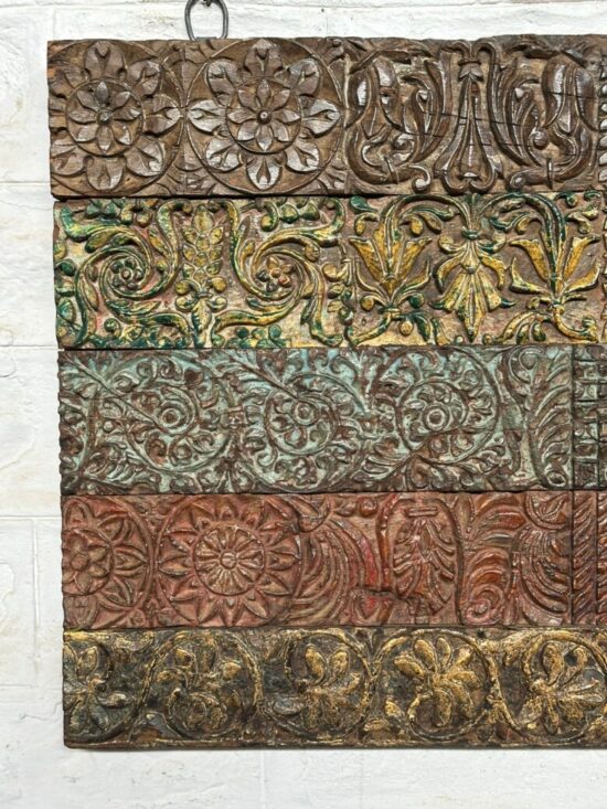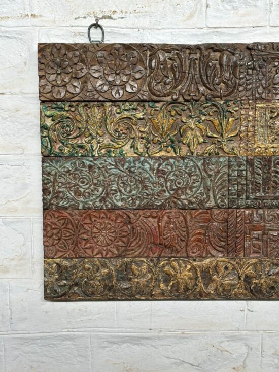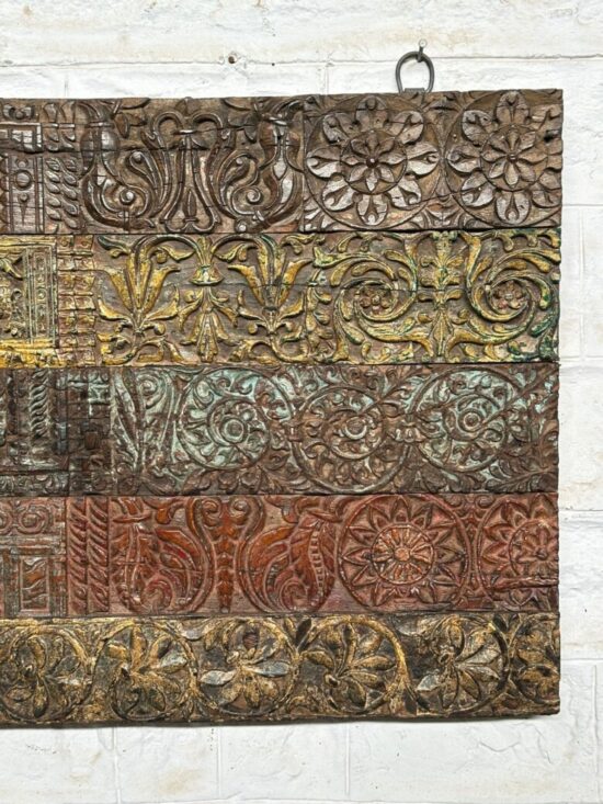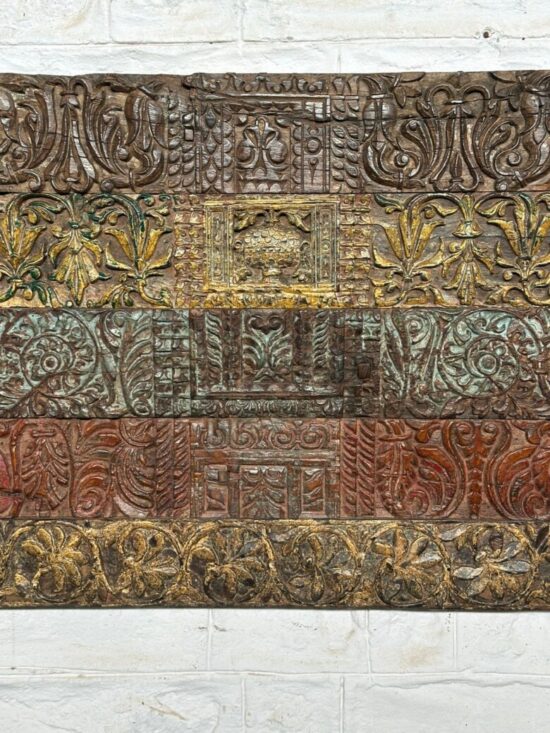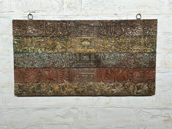 This breathtaking hand-carved wooden wall panel is a statement piece of Indian craftsmanship, featuring intricate floral and geometric carvings. Once part of a traditional Indian temple architecture, this panel was likely used as a lintel or wall accent.
