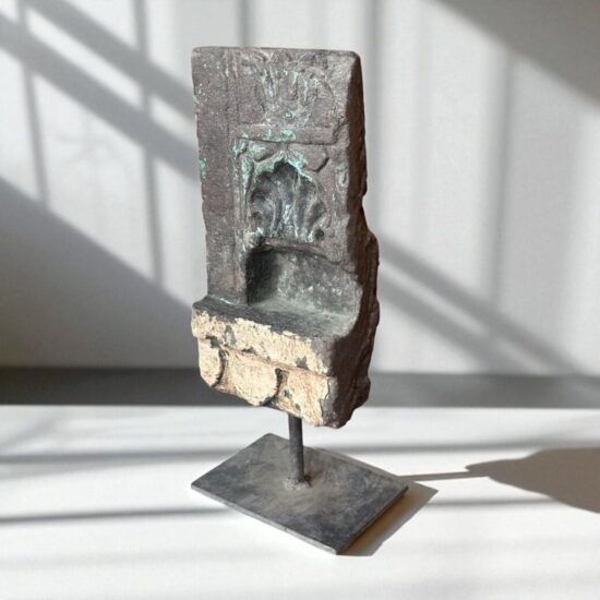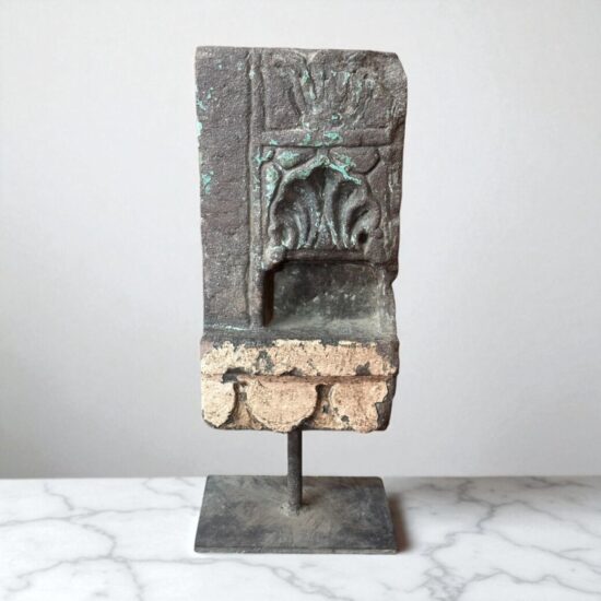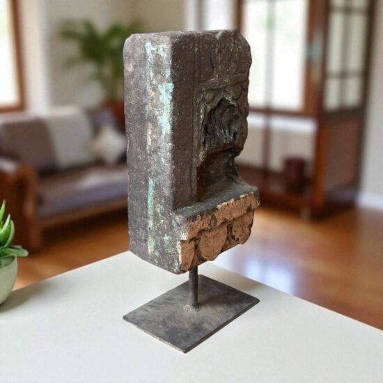 Mounted on a custom iron stand, this piece can be used as a spiritual decor element, a candle or diya holder, or as a striking architectural accent on a console or altar.