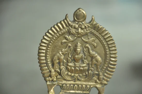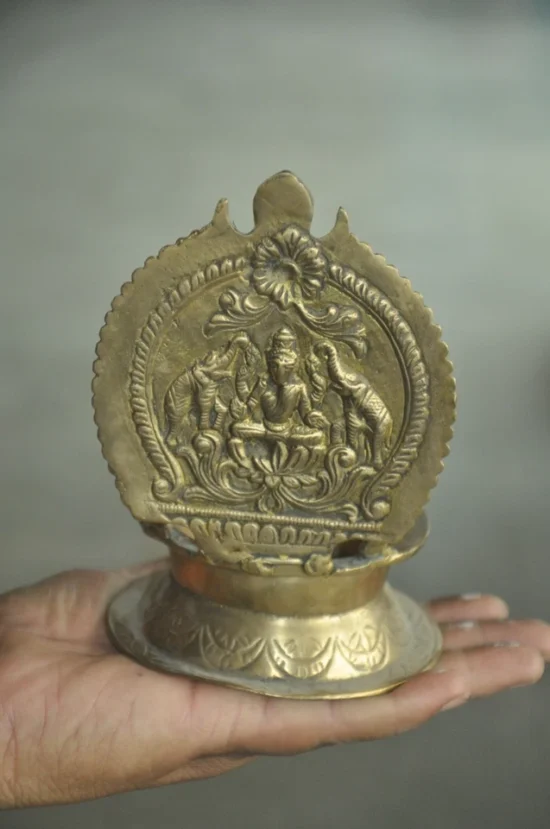 This exquisite handcrafted brass oil lamp is a rare collectible piece, approximately 90 to 100 years old, featuring detailed engravings of Goddess Laxmi, the goddess of wealth and prosperity, flanked by majestic elephants—symbols of strength and auspiciousness.
