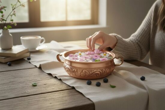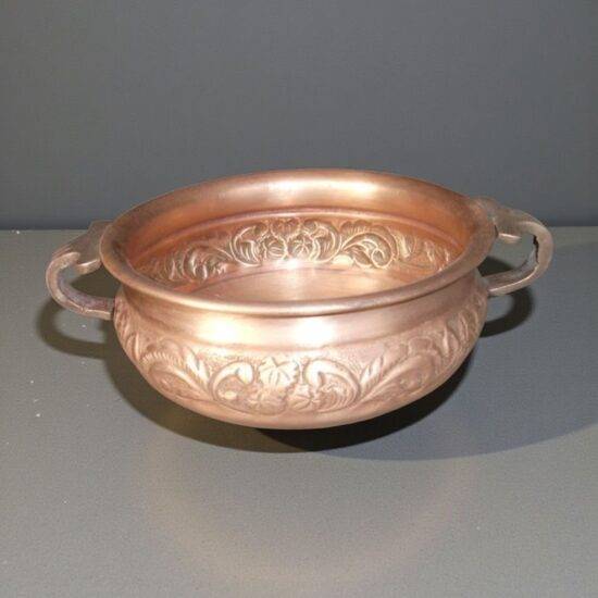 Made from solid copper with a finely embossed decorative border and classic double-handle design, this urli adds warmth, heritage, and an authentic Indian aesthetic to any space. Its smaller size makes it ideal for table styling, shelf décor, coffee tables, or pooja rooms.