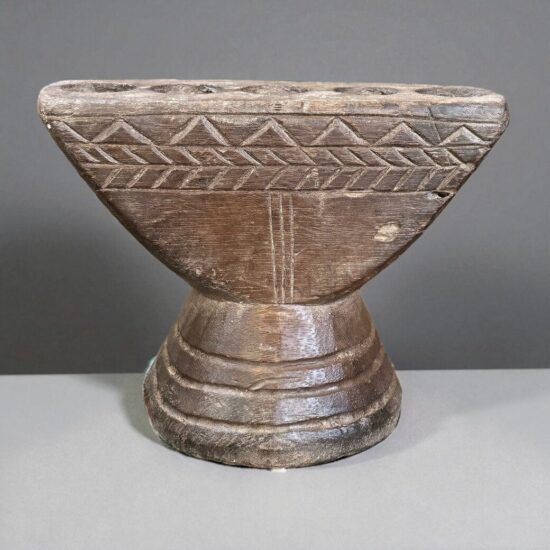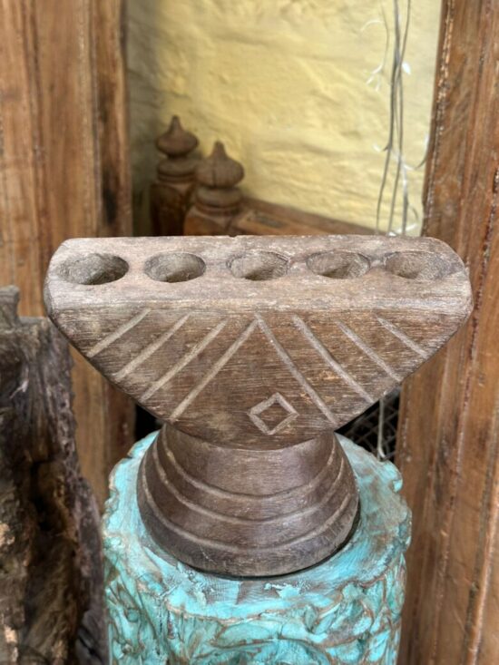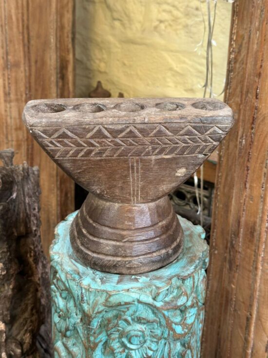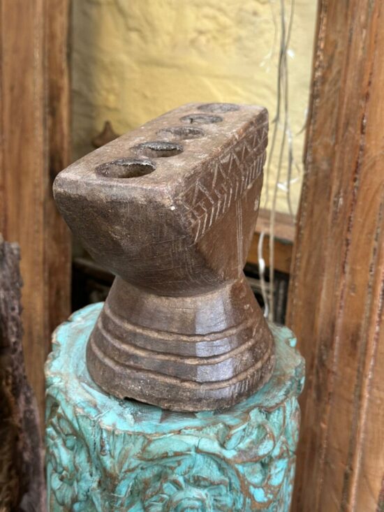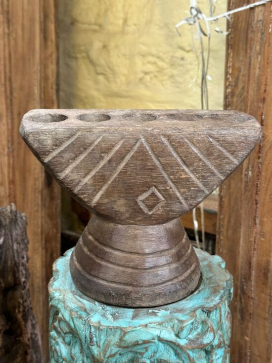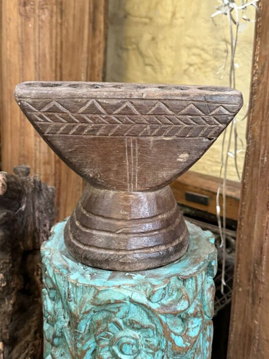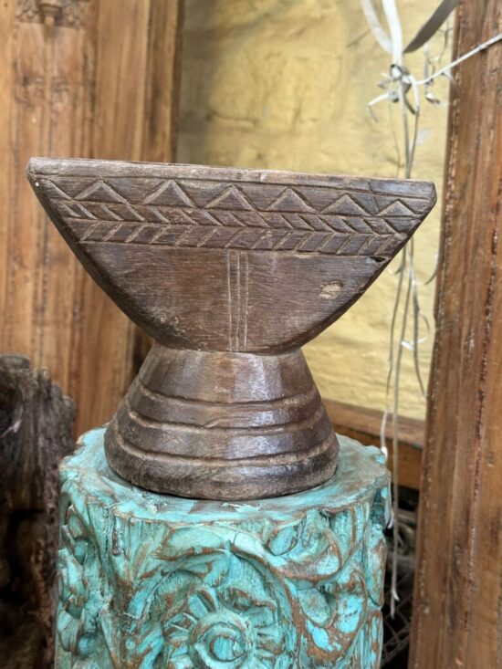 Carved from solid teak wood, the bijani has a distinctive geometric carved design and an aged patina developed over decades of use. While it once had a purely functional purpose, today it stands as a folk collectible, admired for its simplicity, history, and organic form.