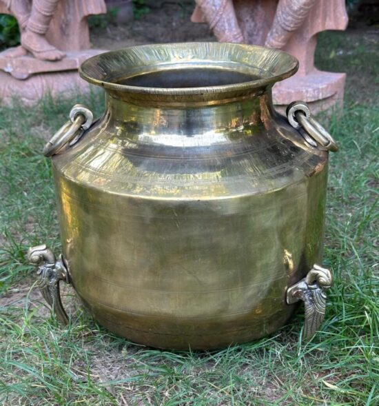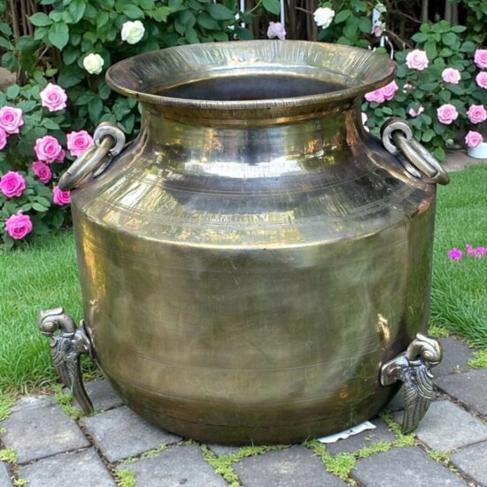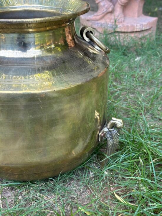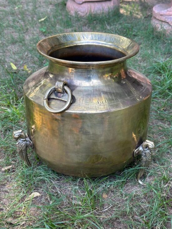 The pot is solid brass, beautifully aged with a rich natural patina, and rests on intricately designed peacock legs, adding charm and cultural heritage to its presence. Its large size and weight give it both durability and grandeur, making it ideal as a planter, decorative centerpiece, or heritage collectible.