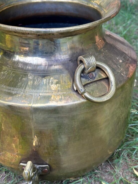 This antique brass pot carries the artistry of India’s metal craft traditions and is both functional and collectible.