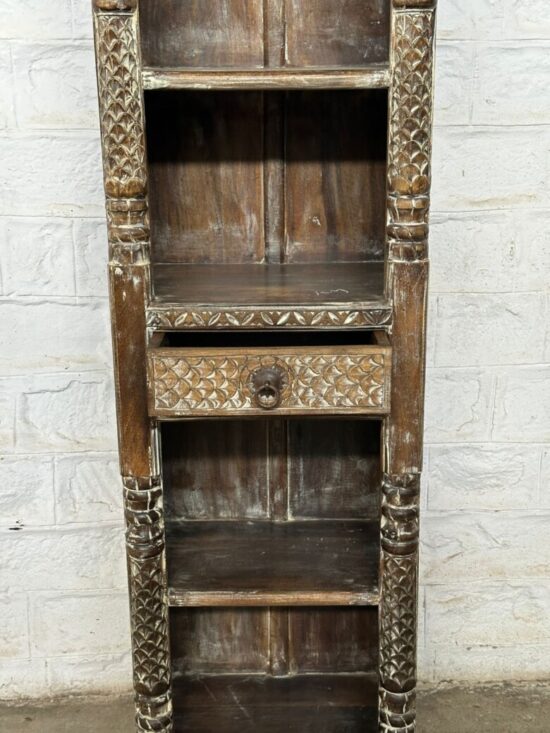 Bring timeless charm into your home with this Vintage Indian Carved Wooden Bookshelf, dating back to the 1940s. Handcrafted from solid wood, this tall and elegant shelf features beautifully carved details, multiple open shelves, and one functional drawer for extra storage. Its rustic patina and intricate Indian craftsmanship make it not only a practical storage solution but also a stunning decor piece.