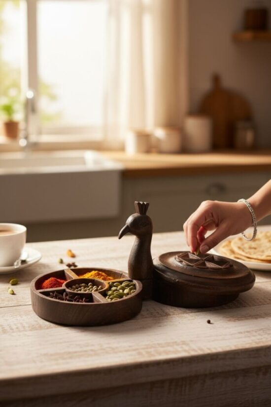 The box opens to reveal five separate compartments, making it both decorative and functional. The natural patina and intricate detailing reflect the skill of Indian artisans and the cultural heritage of rural India.