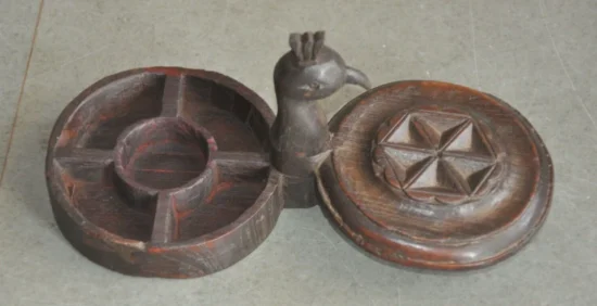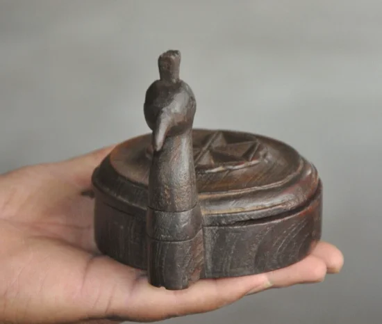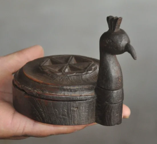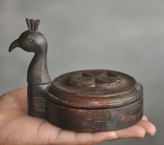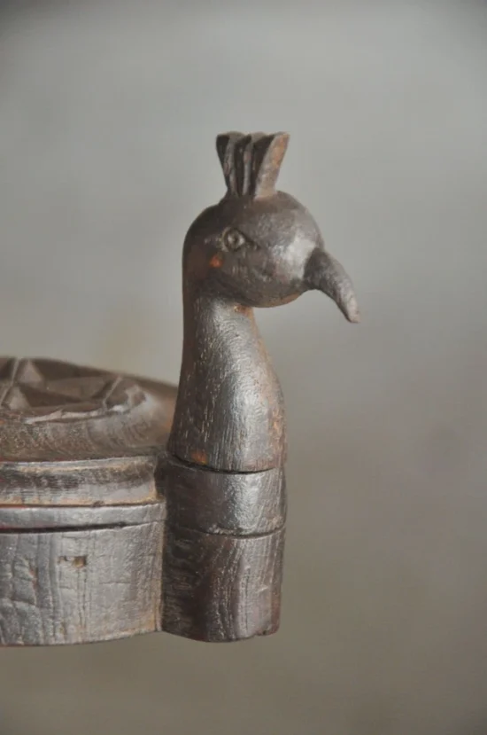 This Antique Wooden Kumkum Box is a rare and charming piece of Indian craftsmanship, featuring a beautifully hand-carved peacock design on the lid. Made from solid wood, this 60–70-year-old piece was traditionally used to store kumkum, rice, or powders during rituals and ceremonies.
