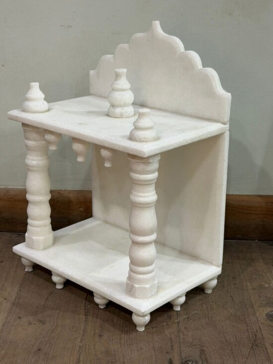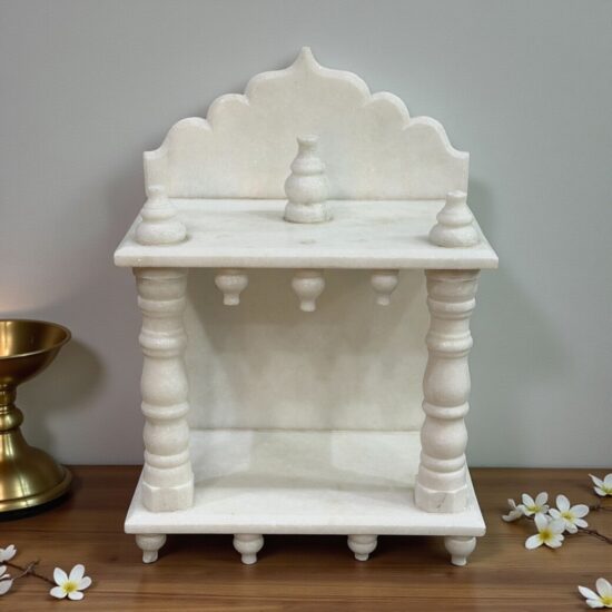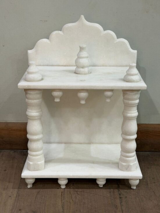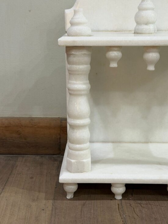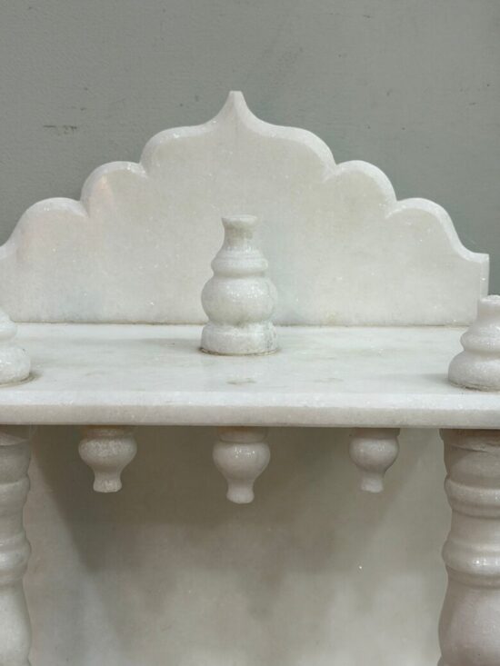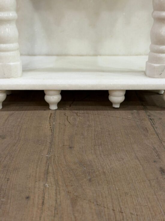 Carved from solid white Makrana marble, this heavy temple features a beautifully polished surface with intricately turned pillars and a gracefully arched back design. Its timeless form makes it ideal for both home and office pooja rooms, radiating serenity and sophistication.