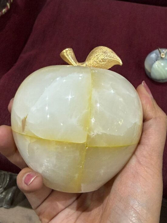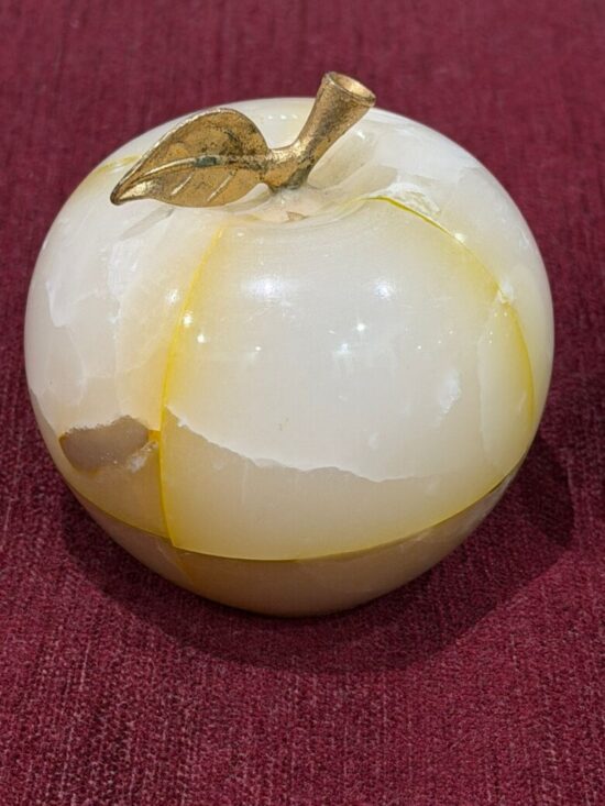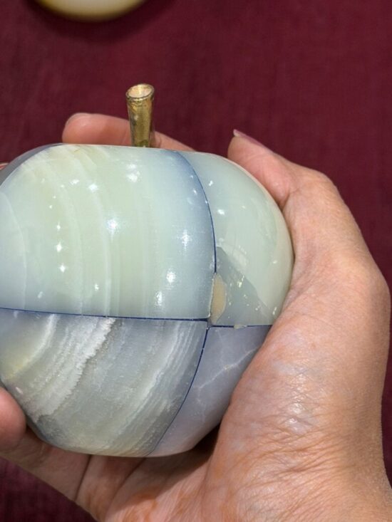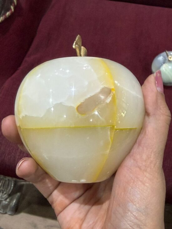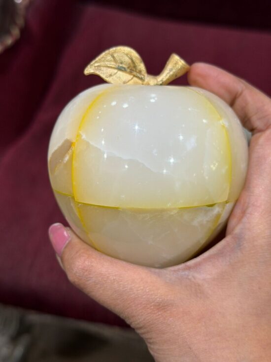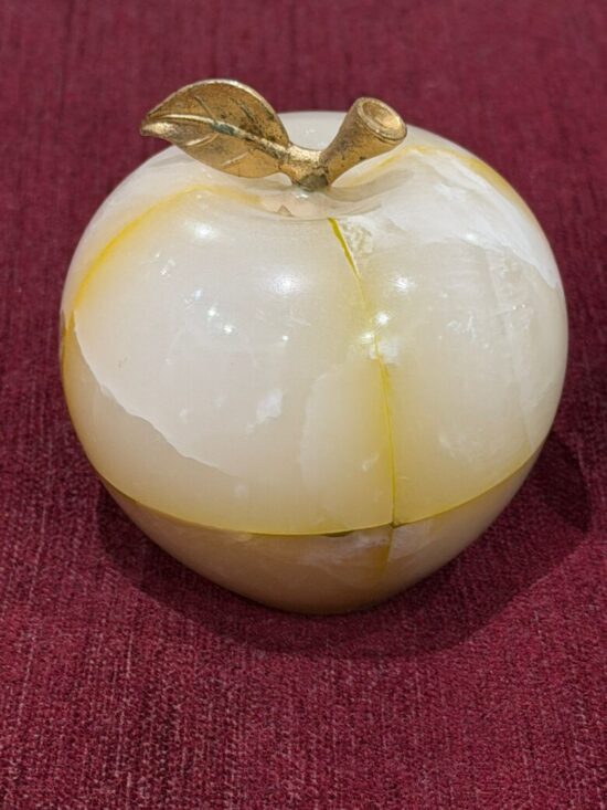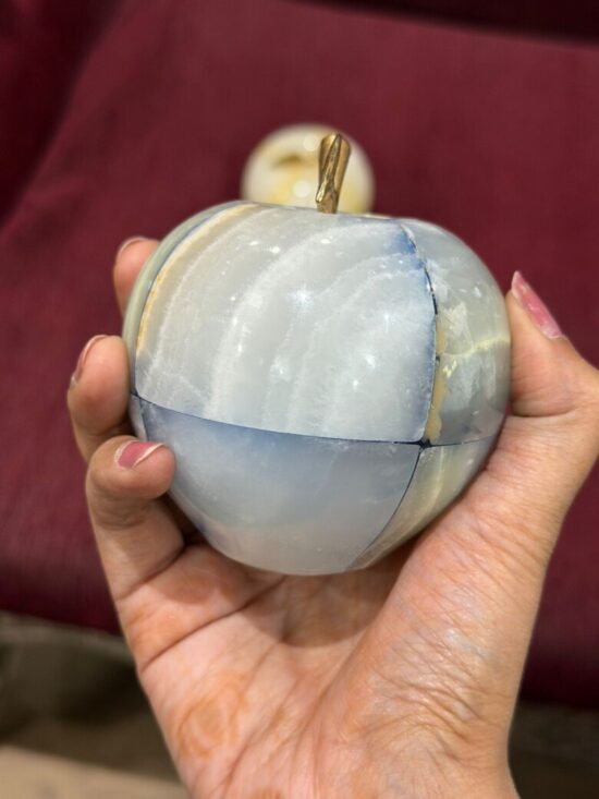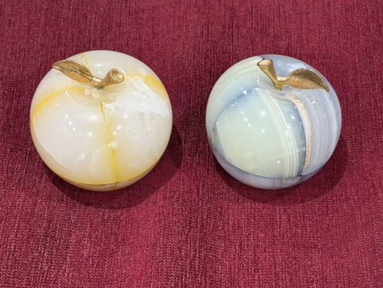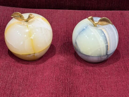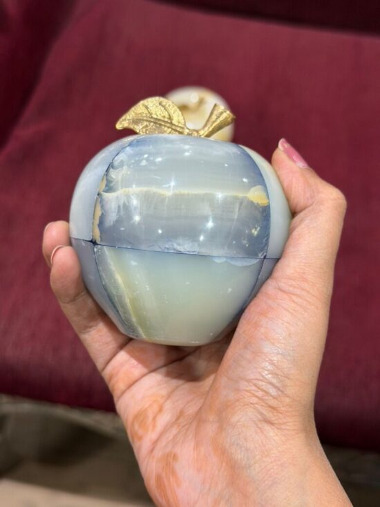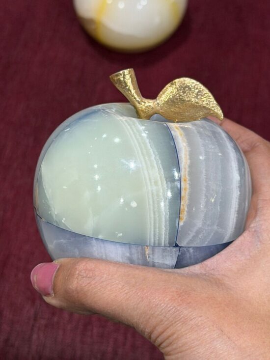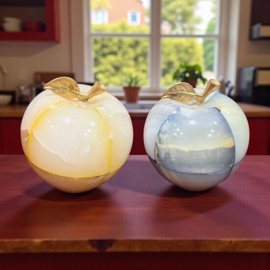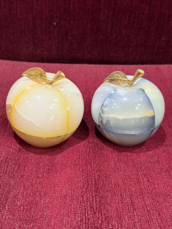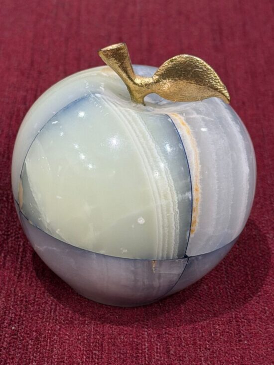 Each apple is meticulously carved from solid precious onyx stone, polished to a smooth, glossy finish that highlights the stone’s natural color bands and veining. The subtle variations make every piece one-of-a-kind, reflecting the artistry of hand-carved craftsmanship.