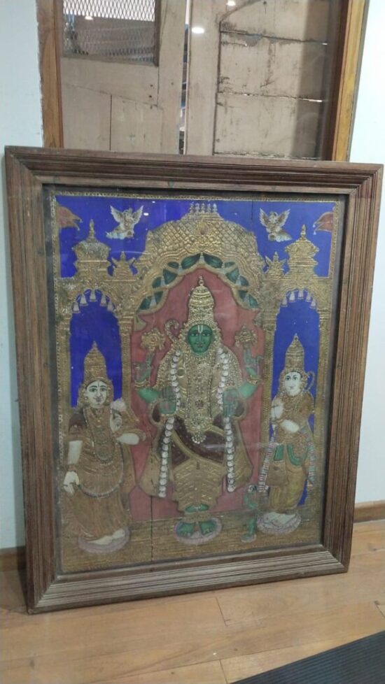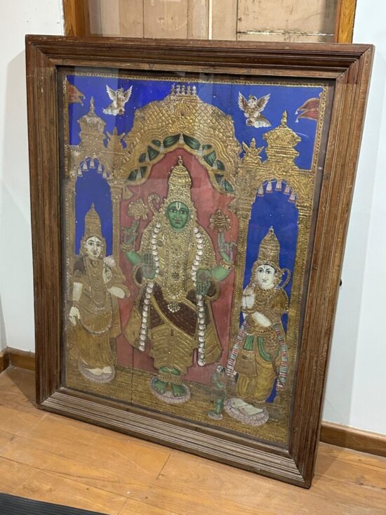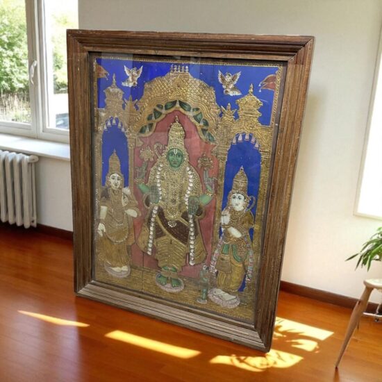 Housed in its original handcrafted wooden frame, this piece reflects the classic Thanjavur school of art known for its rich iconography, layered relief work, and spiritual aura. It’s not just a painting — it is a living piece of sacred history, ideal for temples, collectors, museums, or luxury interiors.