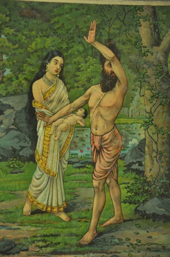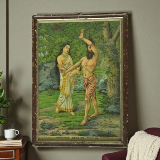 This is a rare and collectible lithograph print by the iconic Indian artist Raja Ravi Varma, depicting the mythological moment of Sakuntala Janam. The artwork is rich in storytelling and color, rendered with the distinct depth and emotion for which Ravi Varma is celebrated.