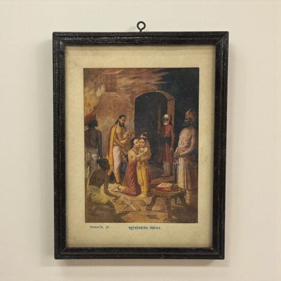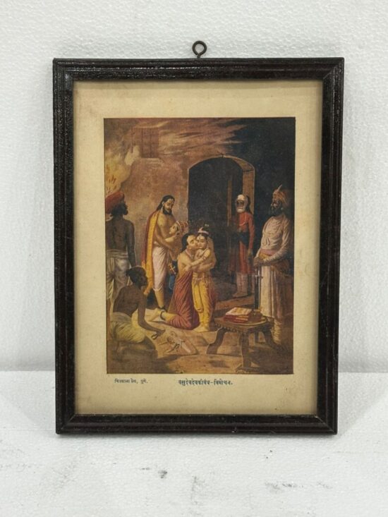This authentic lithographic print depicts a powerful mythological scene from the life of Lord Krishna, capturing the master artist’s distinctive blend of realism, grace, and divinity. The print is housed in its vintage solid teak wood frame, showcasing gentle wear that adds timeless character and authenticity.