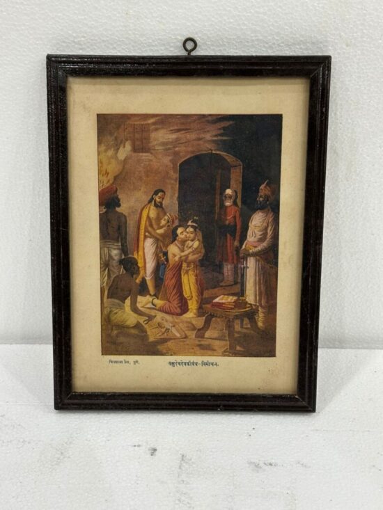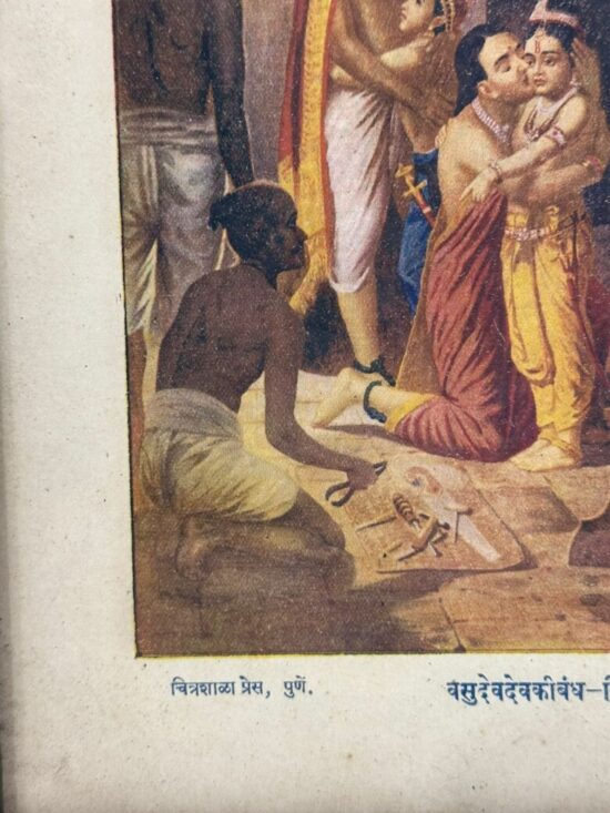 Own a rare piece of Indian art history with this original Raja Ravi Varma lithograph titled “Vasudeva Devakibandh Vimochan”, printed by the renowned Chitrashala Press, Pune — one of the earliest printing houses to reproduce Ravi Varma’s iconic works.