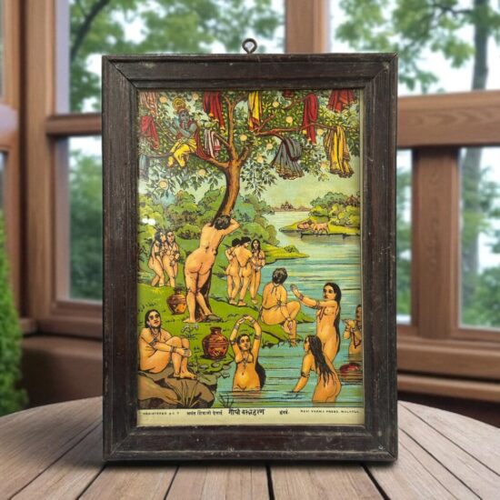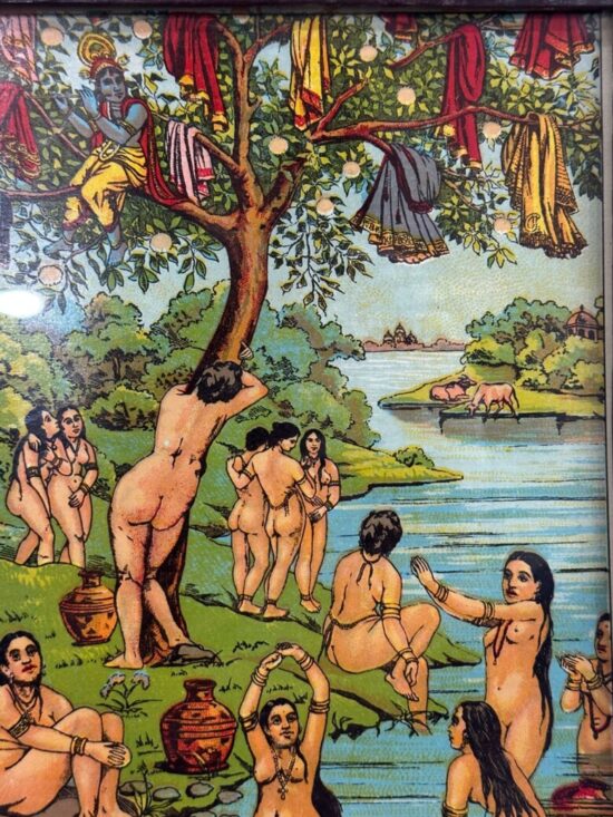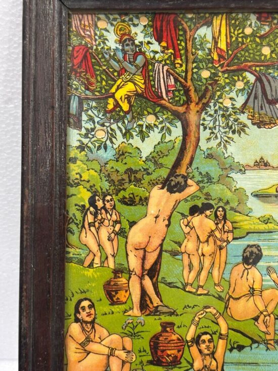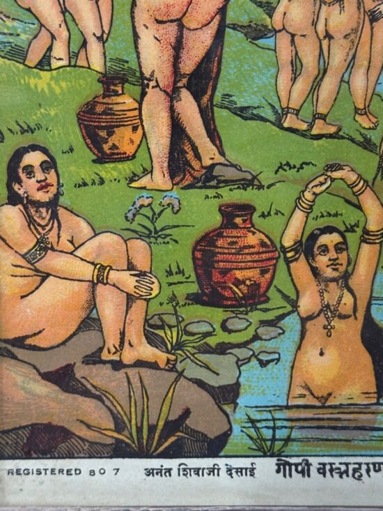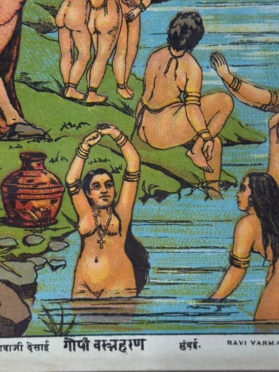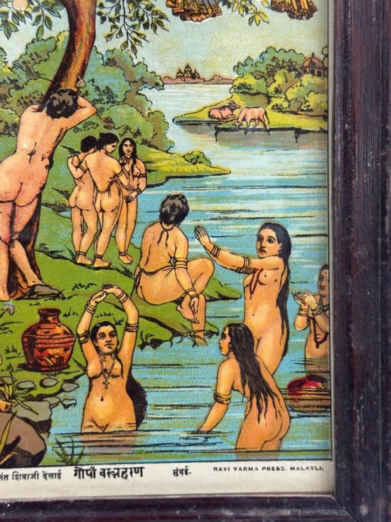 “Gopi Vastraharan” is one of the most reproduced and sought-after Ravi Varma themes, highly prized among collectors.
