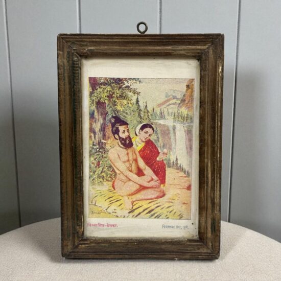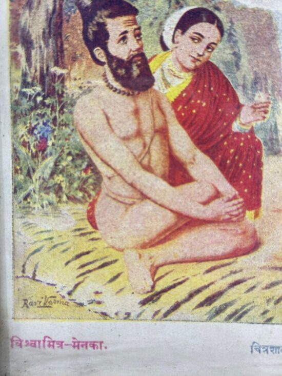 This oleograph depicts Vishvamitra, a sage (rishi), and Menaka, an apsara (celestial nymph) from Hindu mythology.