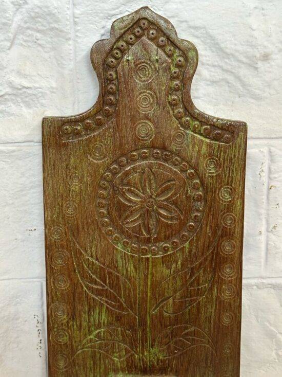 The back panel is adorned with detailed hand-carved motifs, including a central floral medallion and leafy patterns that symbolize growth and harmony. The elegant top arch and dotted detailing further enhance its traditional appeal, reflecting classic Indian craftsmanship that has been passed down through generations.
