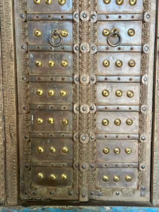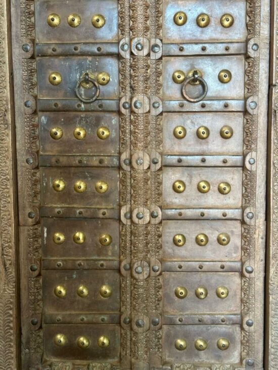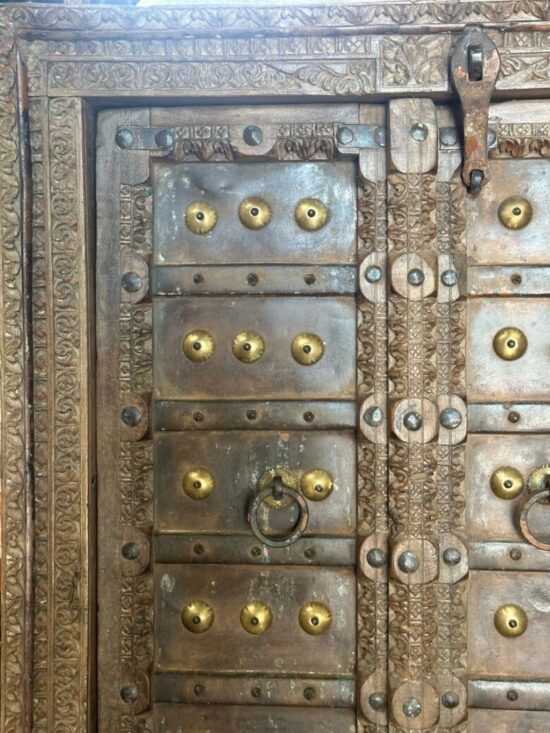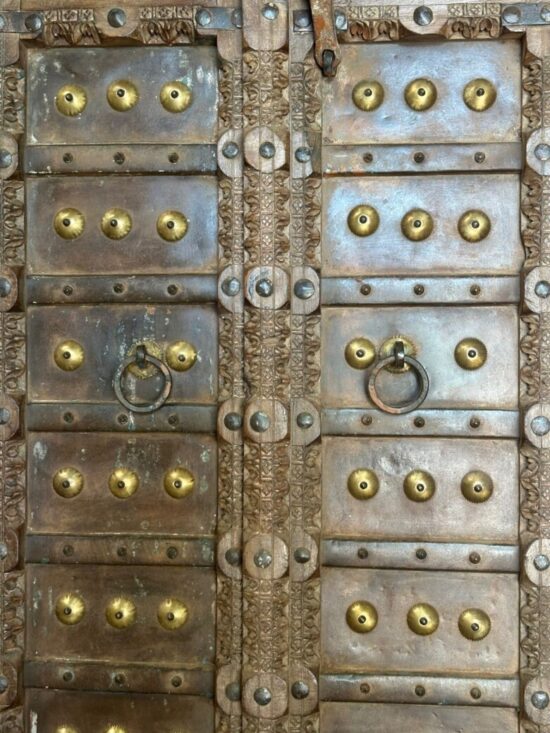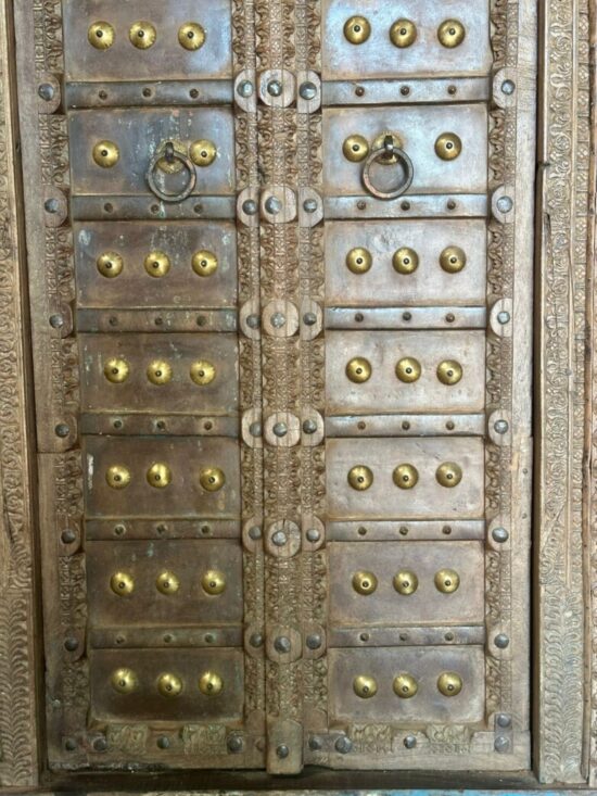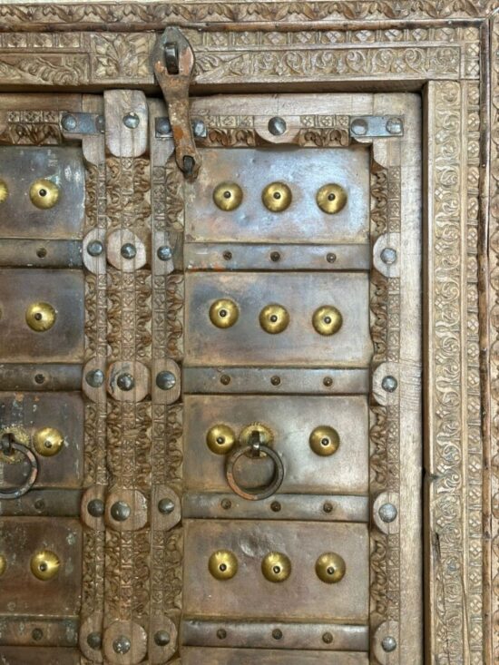 Each piece is intricately carved by skilled artisans, with a frame that showcases traditional Indian motifs and textured patterns that have weathered over time to create a stunning natural patina. The window doors are adorned with eight brass medallions, reminiscent of ancient temple or haveli doors, and the solid central wooden bar evokes a sense of strength and tradition.
