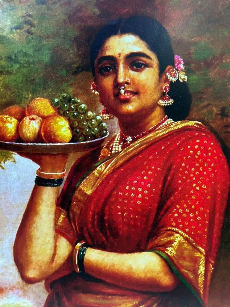 Madri Carrying a Tray of Fruits: A Symbol of Grace and Tradition: This particular artwork, “Madri Carrying a Tray of Fruits,” exemplifies Ravi Varma’s mastery. Madri, a character from the Indian epic Mahabharata, is depicted with utmost grace and poise as she carries a tray of fruits. The print beautifully encapsulates her elegance and the cultural richness of the era, making it a visual delight for art enthusiasts and admirers of Indian heritage.