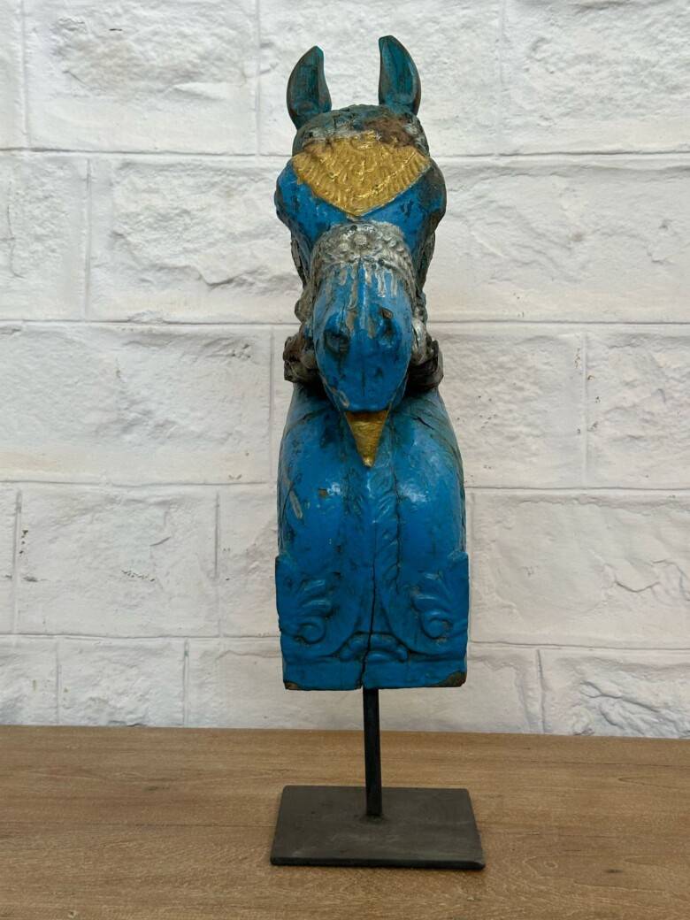 Carved out of solid teak wood, the sculpture is adorned in a vivid, aged blue paint, with subtle traces of gold and silver leaf work still visible, highlighting its regal origins. The posture of the horse, with its upright ears and strong neck, suggests alertness and pride—qualities revered in Indian mythology and royal traditions. The carving is rich in detail, from the harness around its snout to the floral and linear patterns etched into its body, giving it a dynamic and expressive character.