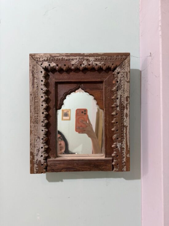 This is an authentic vintage Indian hand-carved mirror frame, crafted in solid teak wood and featuring traditional architectural detailing. The frame showcases intricate carving along the borders, including scalloped edges, pierced motifs, and a classic Indian arch top that reflects the design vocabulary of old havelis and heritage homes.