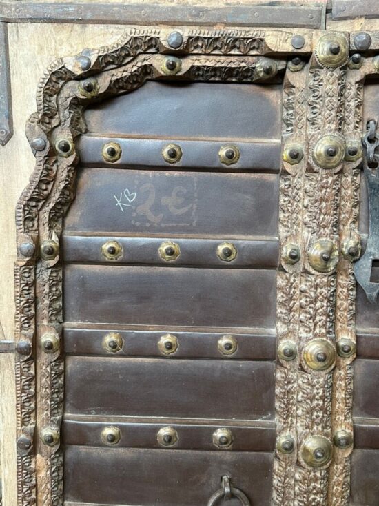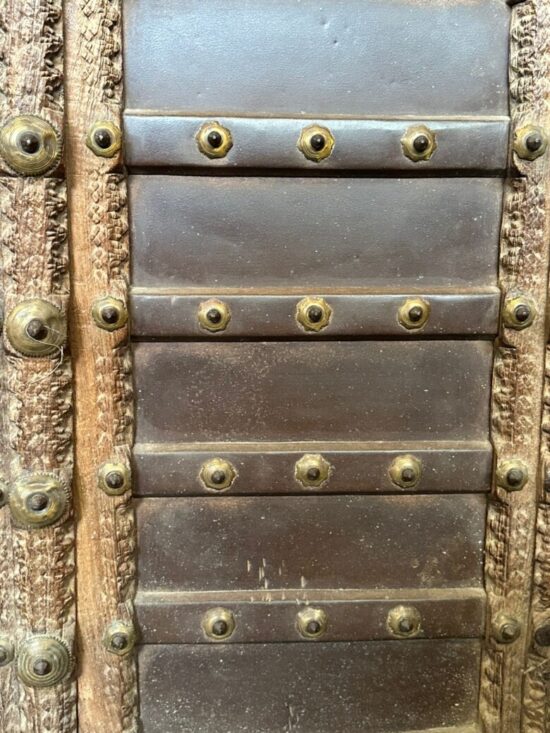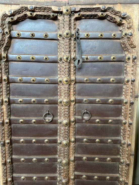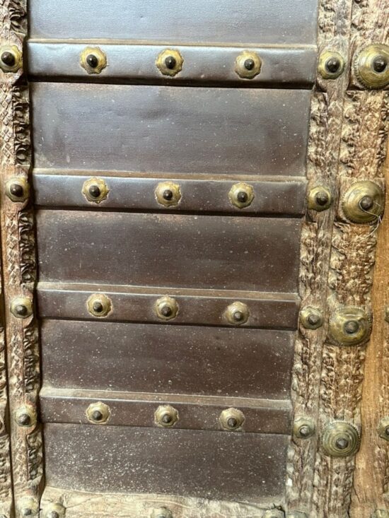 This stunning vintage Indian door is handcrafted from solid teak wood and features intricate brass and iron accents. Measuring approximately 34 x 70 inches, this antique double door showcases the elegance of traditional craftsmanship with beautifully aged wood, embossed iron straps, and decorative brass studs. Likely over 70 years old, this door once adorned a heritage haveli or temple in India.