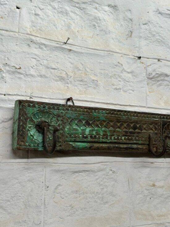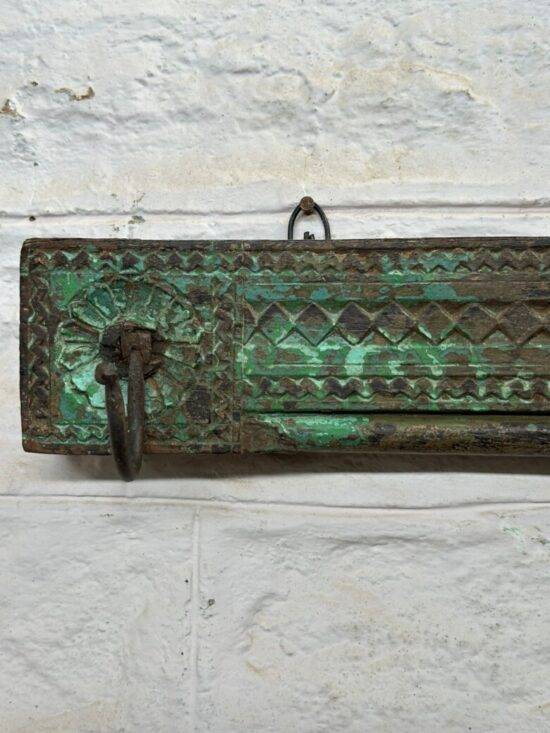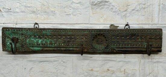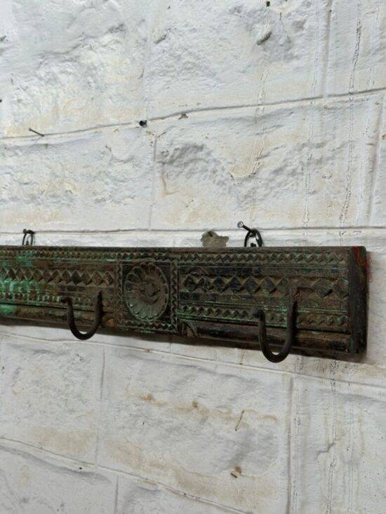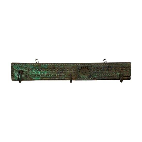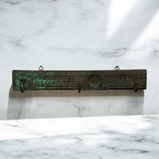 This stunning antique teak and brass hook panel is a handcrafted piece of Indian heritage, perfect for adding a rustic, vintage accent to any wall. Measuring 27 x 5 x 5 inches, this panel features intricate engraved patterns and retains its original aged green patina, showcasing its decades of history and charm.