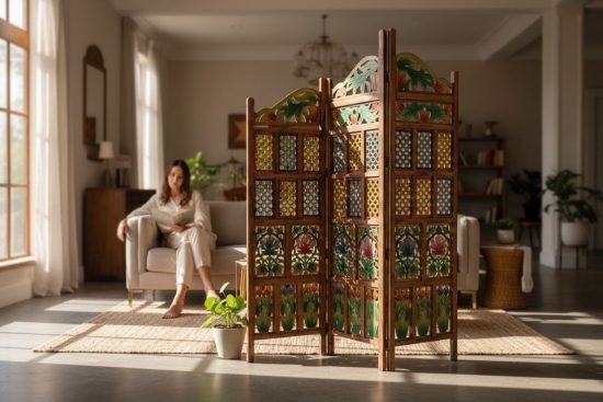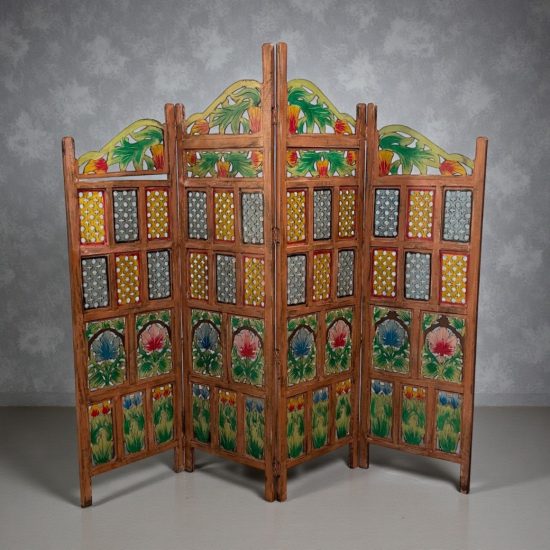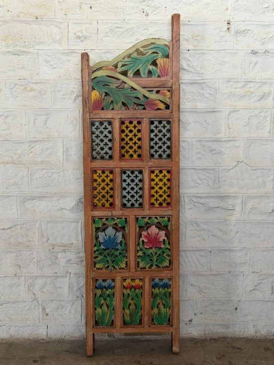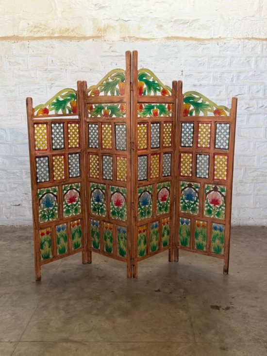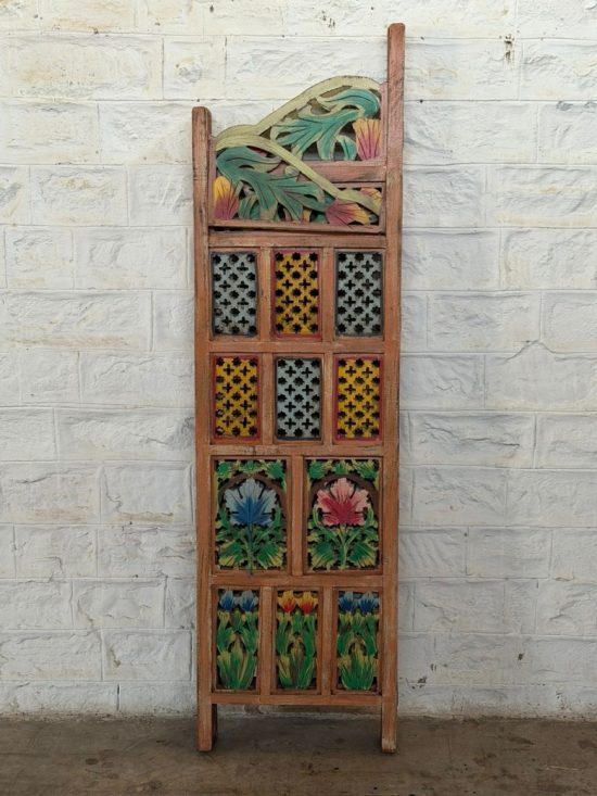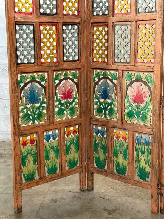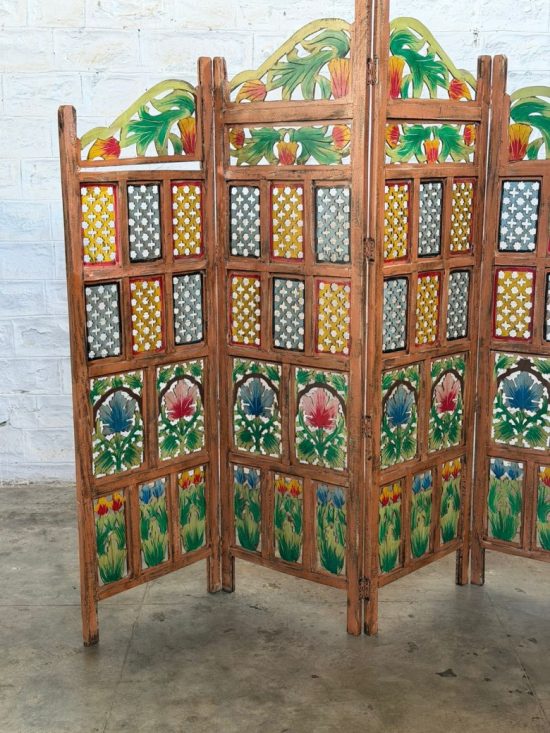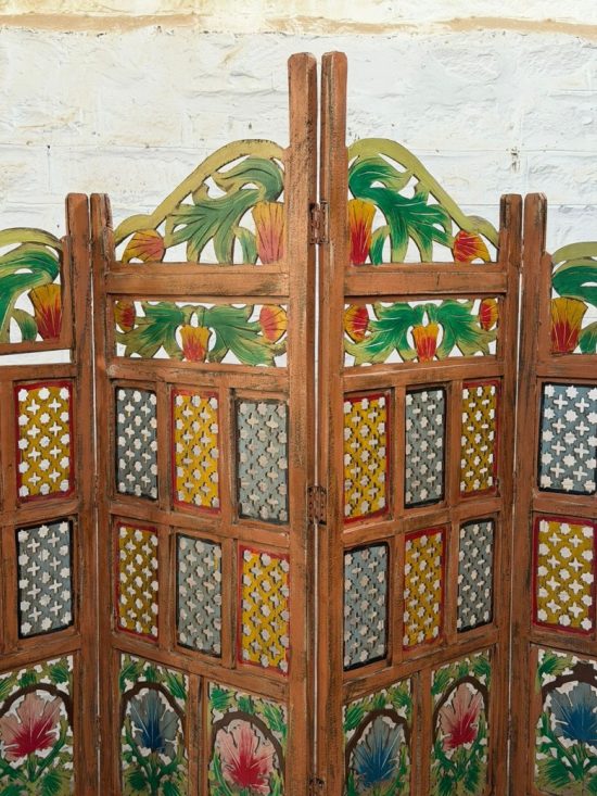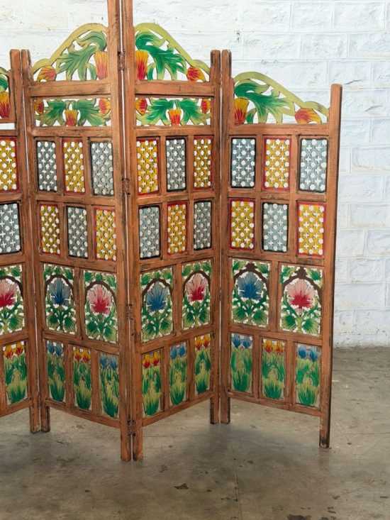 A beautiful handcrafted wooden room divider featuring intricate carving and vibrant hand-painted floral panels, inspired by traditional Indian craftsmanship.