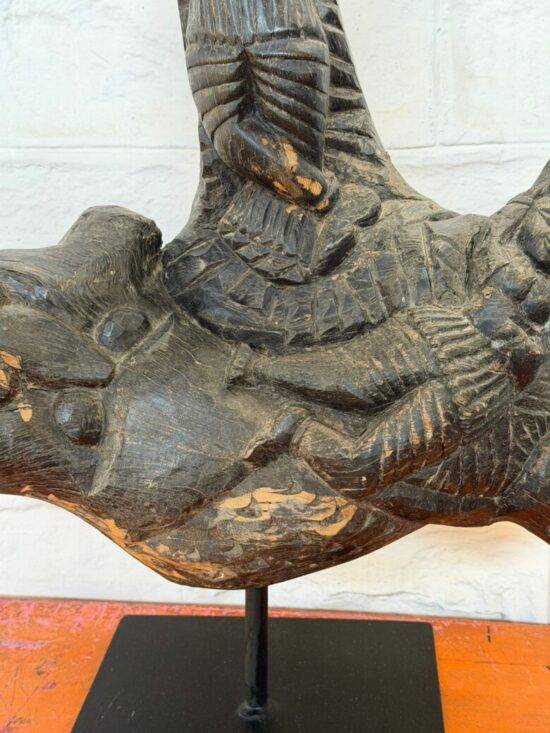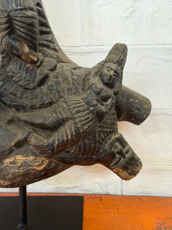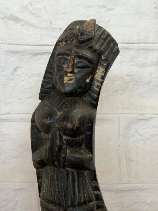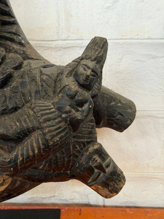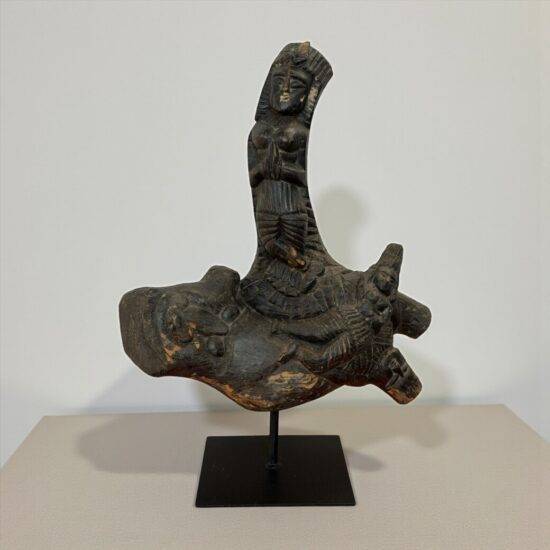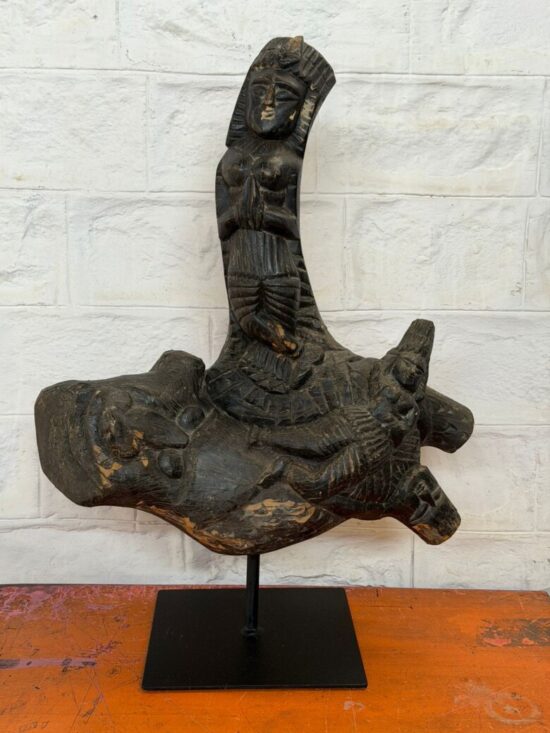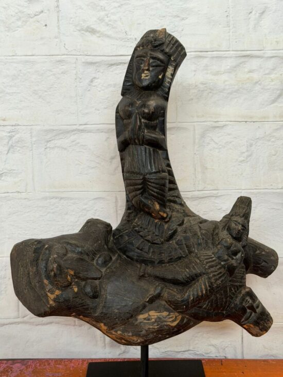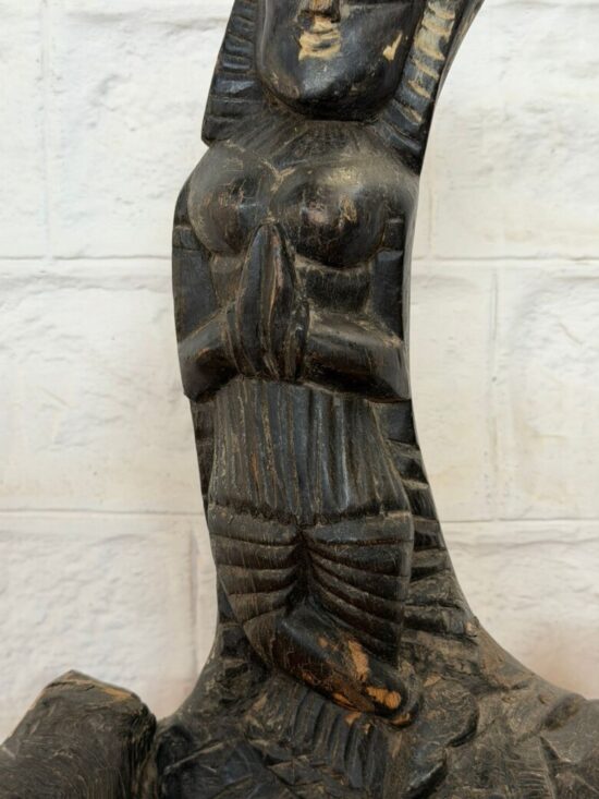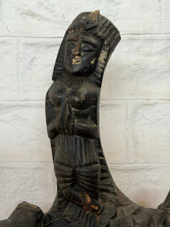 This striking sculpture features a beautifully carved divine/tribal female figure seated in a prayer posture, positioned over an intricately carved mythical creature. A stunning example of old-world craftsmanship, the piece carries deep character, weathered texture, and an authentic aged patina that only centuries can create.