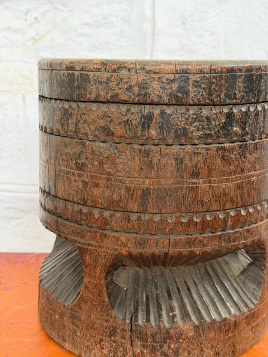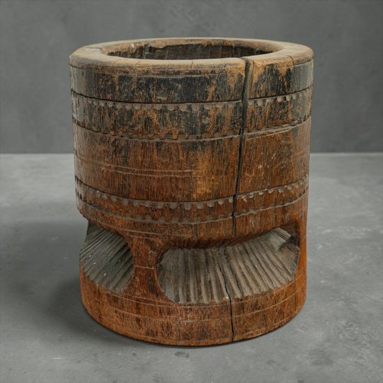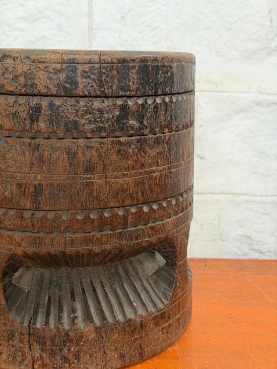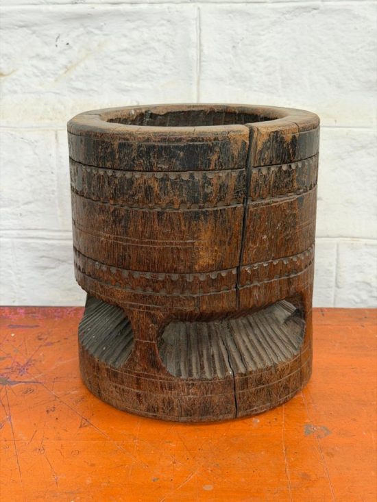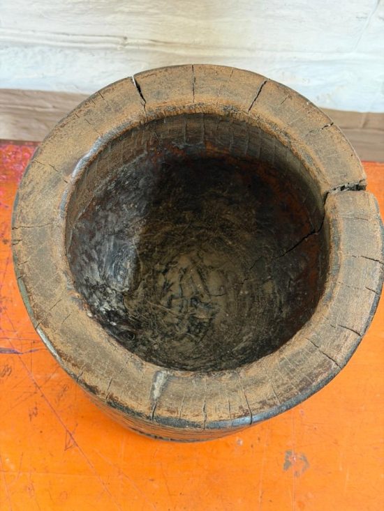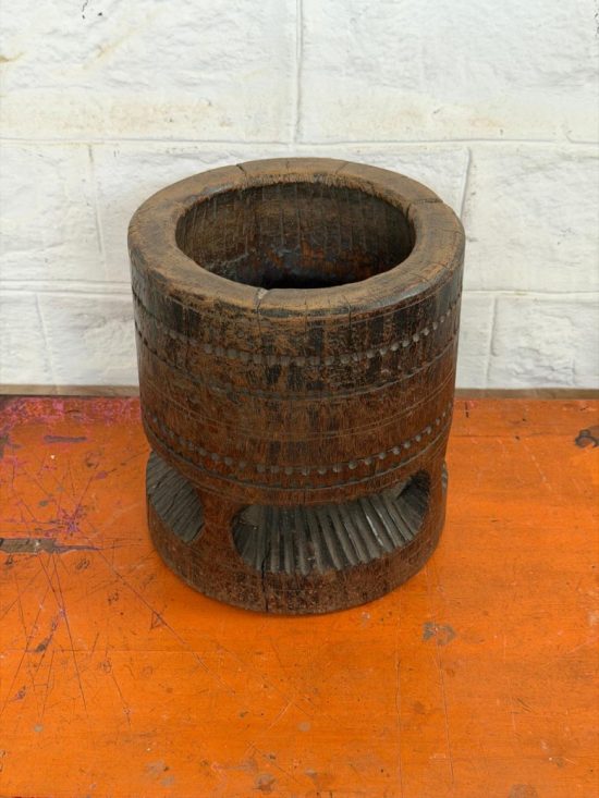This rare vintage Indian wooden grinder pot is one such piece — hand-carved decades ago, likely used in a rural household where grains were ground fresh each morning. Before machines and electricity, this was part of a daily ritual — slow, rhythmic, and deeply connected to the land.