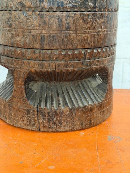 The sculptural form, with its carved openings and heavy cylindrical body, gives it a powerful presence. Today, pieces like this are no longer made — and even harder to find in such raw, untouched condition.