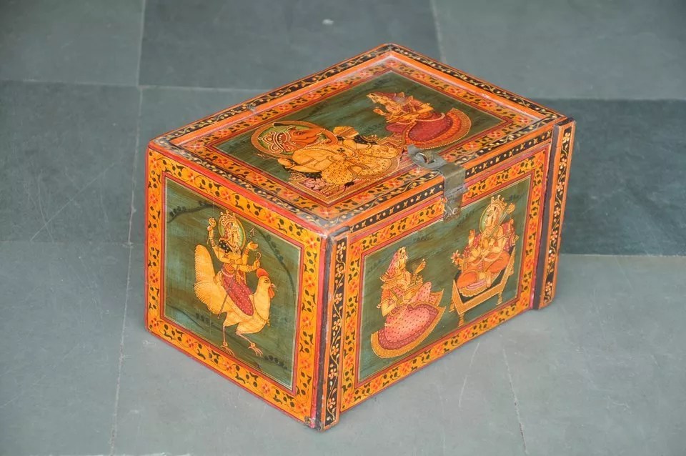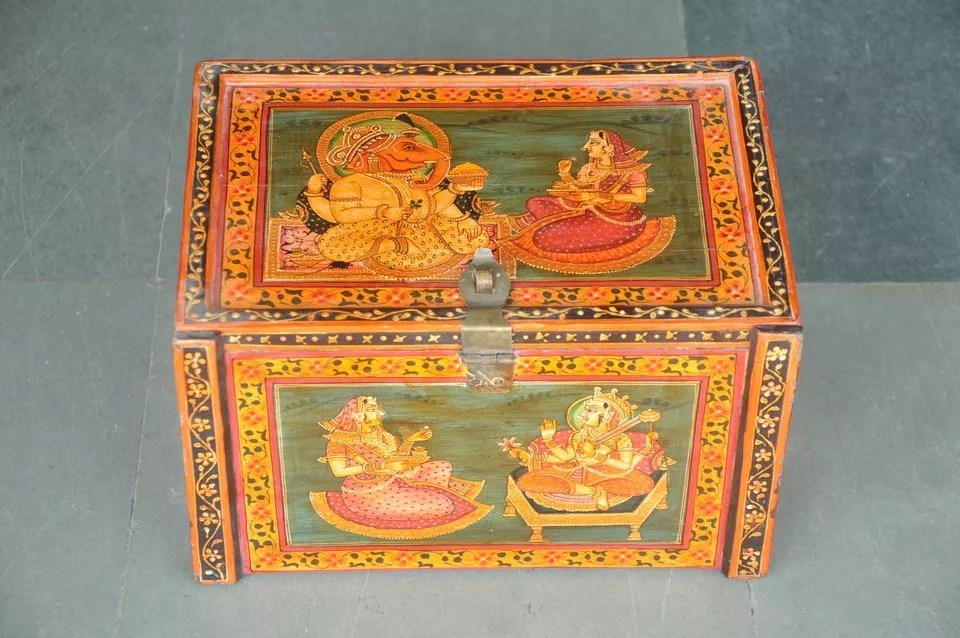 This vintage wooden drawer chest is a rare find, embodying the elegance and cultural heritage of fine Indian craftsmanship. Each of the six compartments is meticulously hand-painted with vibrant and detailed depictions of Hindu deities, adding a spiritual and artistic touch to its practical use. The chest’s compact dimensions make it versatile for various storage needs, while its age and uniqueness make it a prized addition to any antique collection.