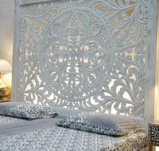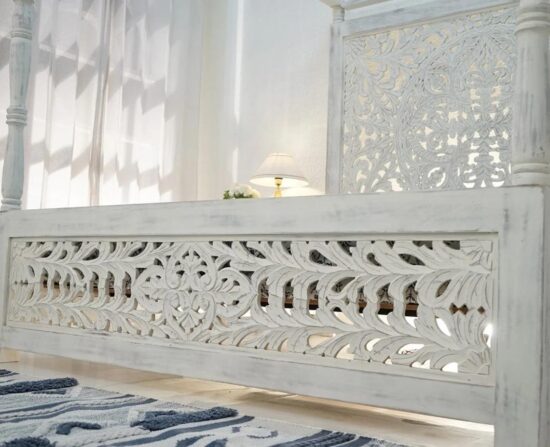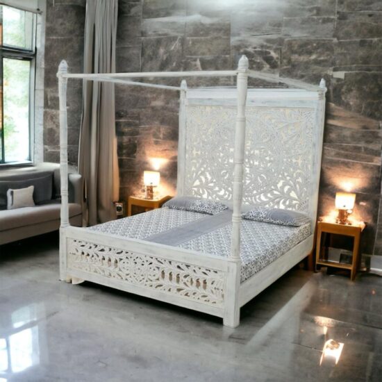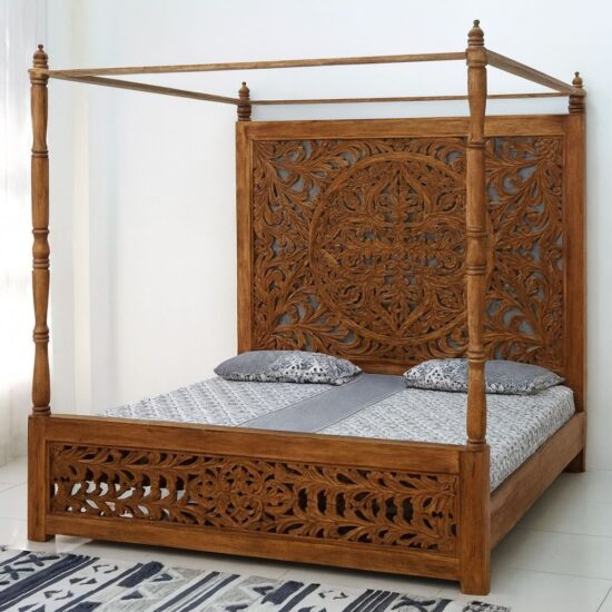 Transform your bedroom into a sanctuary of elegance with this Indian Carved Four Poster Bed, meticulously handcrafted from solid mango wood. This exquisite bed features an intricately carved headboard and footboard, showcasing traditional Indian craftsmanship with detailed floral and geometric motifs.