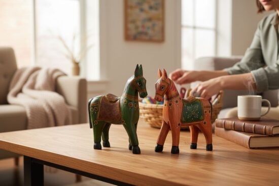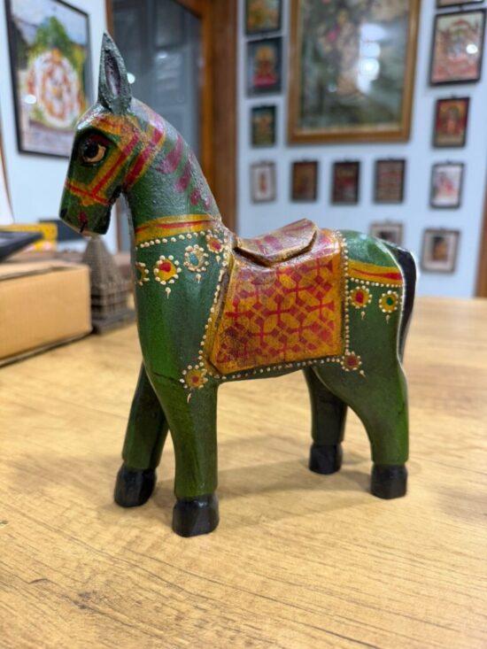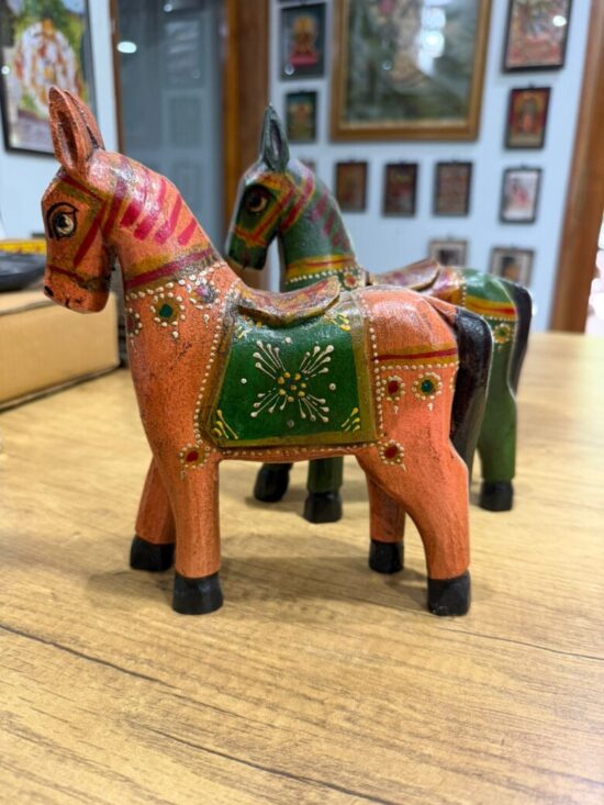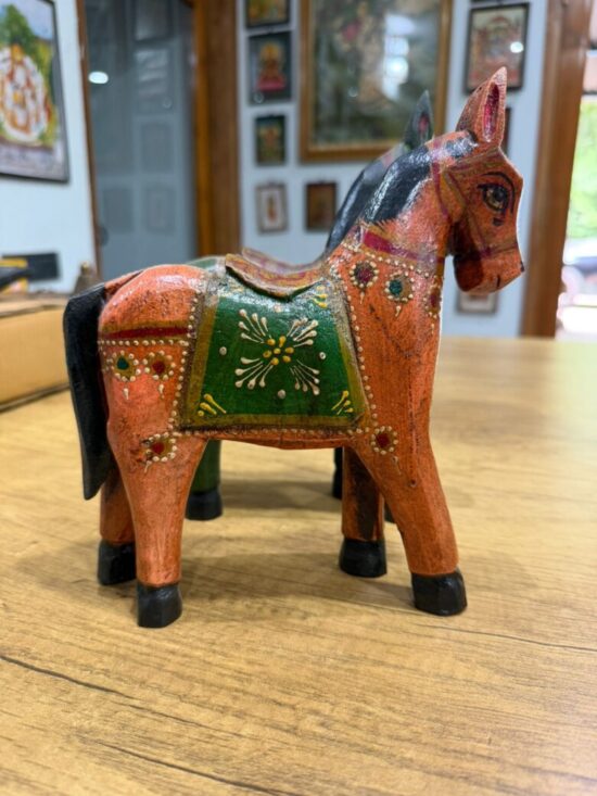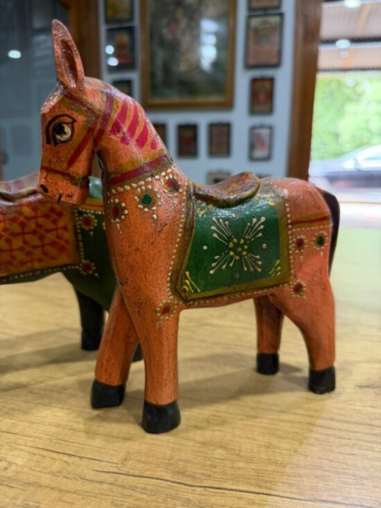 Each horse is made from solid wood, carefully hand-carved and finished with fine motifs using eco-friendly paints. Their vintage-style design makes them perfect for adding color, warmth, and personality to your shelves, consoles, or mantels.