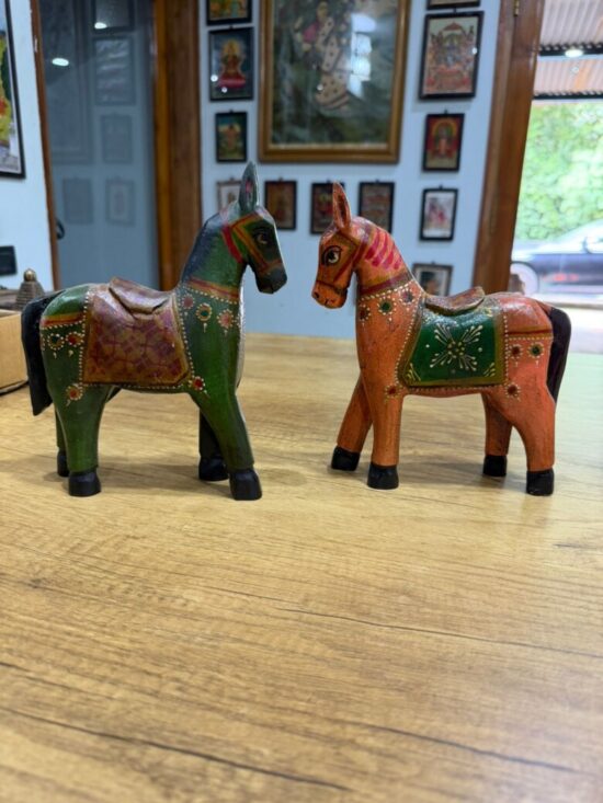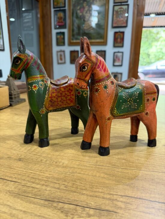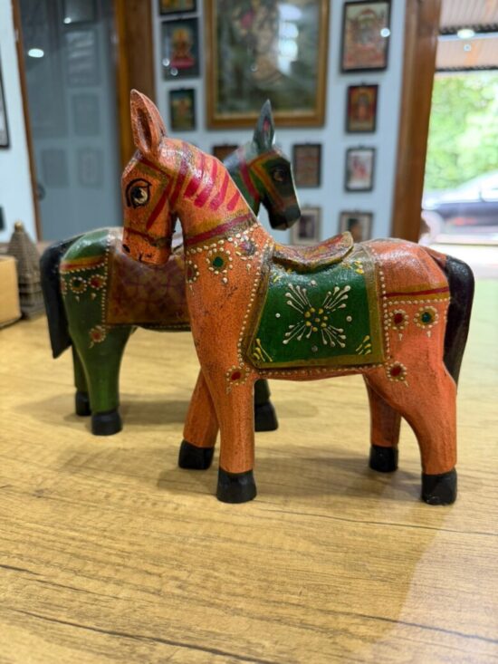 Add a touch of Indian folk charm to your decor with this set of 2 wooden hand-painted horse statues, each crafted and painted by skilled artisans. These vibrant horse figurines feature traditional Rajasthani detailing, with intricate patterns, jewel tones, and miniature-style brushwork that bring life and energy to any space.