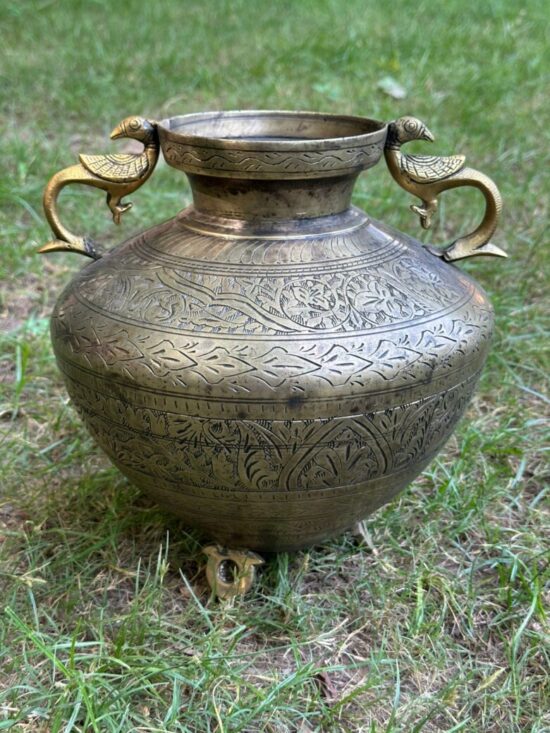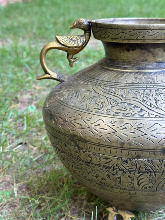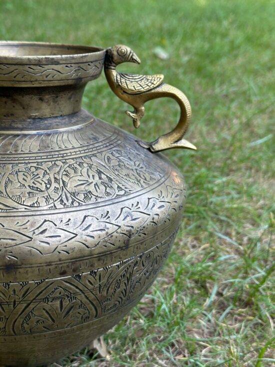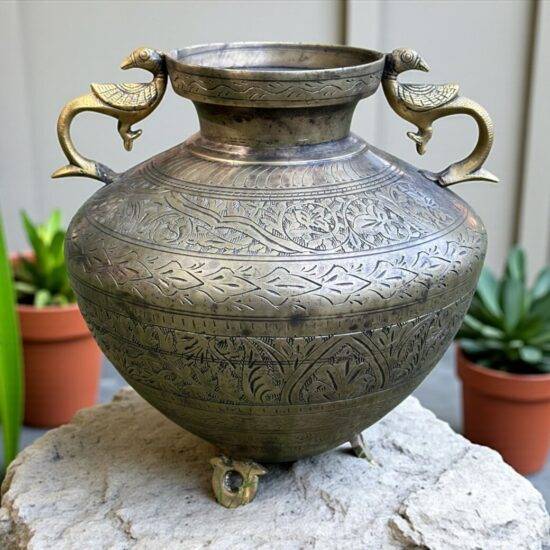 Bring home the elegance of traditional Indian craftsmanship with this Vintage Brass Pot Planter featuring exquisite peacock-shaped handles and detailed hand-engraved motifs. Originally used as a water pot, this piece has now become a versatile collectible that can be repurposed as a planter, centerpiece, or decorative accent.