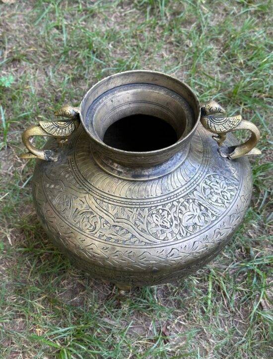 Its rich patina and solid brass weight (3.75 kg) reflect its age and authenticity, making it a perfect heritage piece for your home. The fine detailing on the body and unique handles highlight the mastery of Indian artisans.