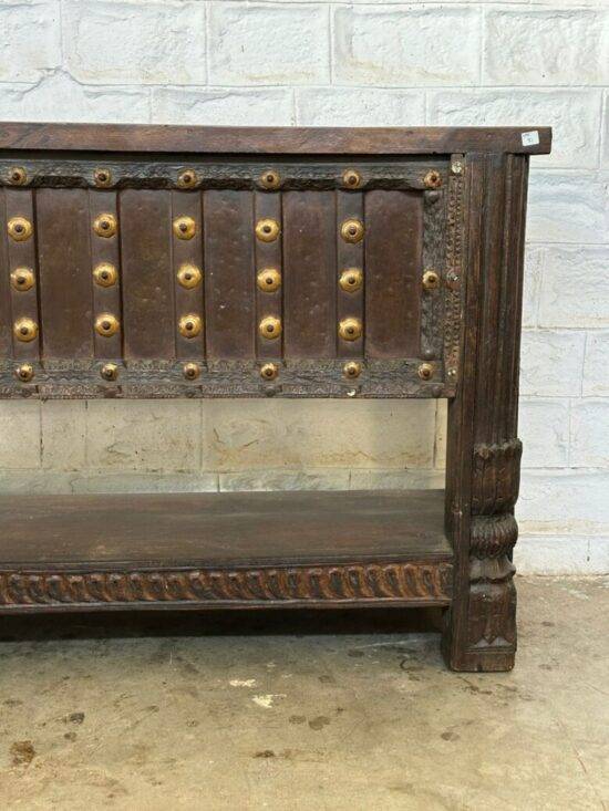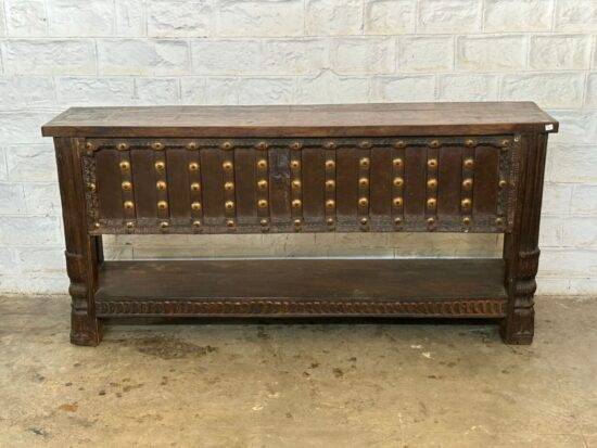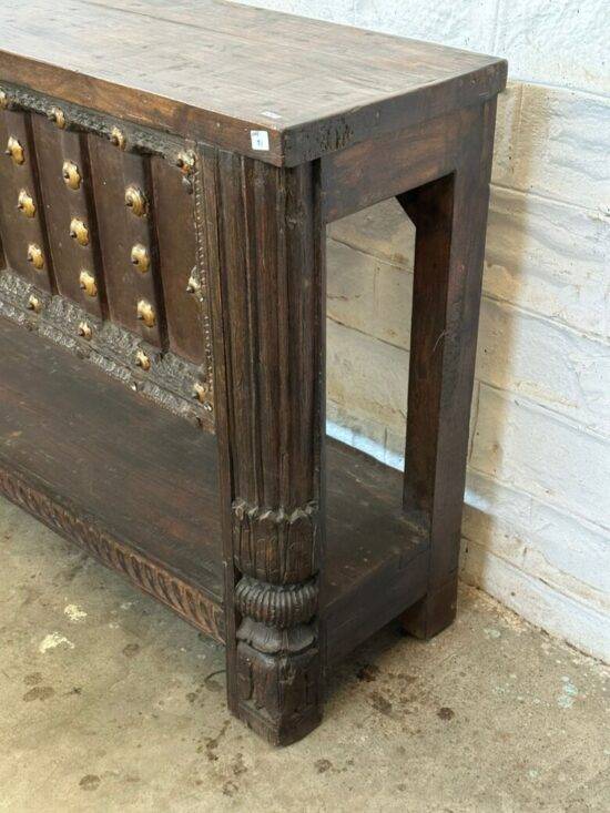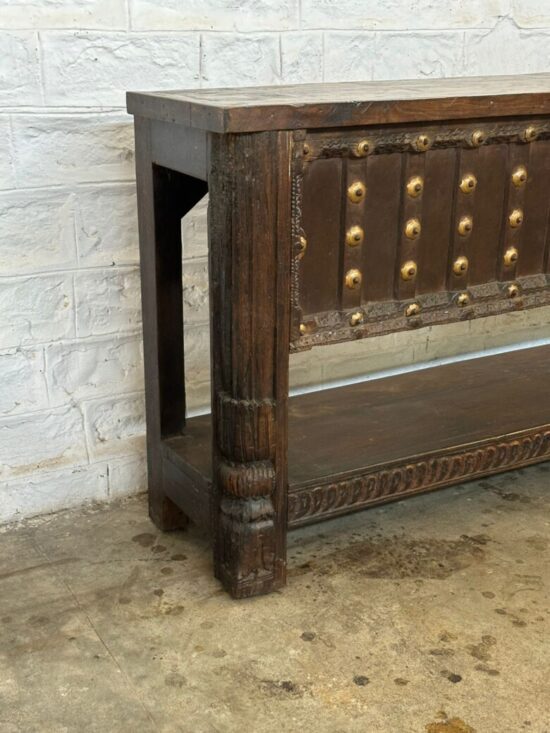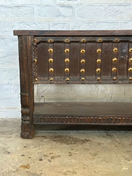 Bring timeless elegance to your home with this Vintage Carved Wooden and Brass Console Table, a rare Indian antique dating back to the 1910s.