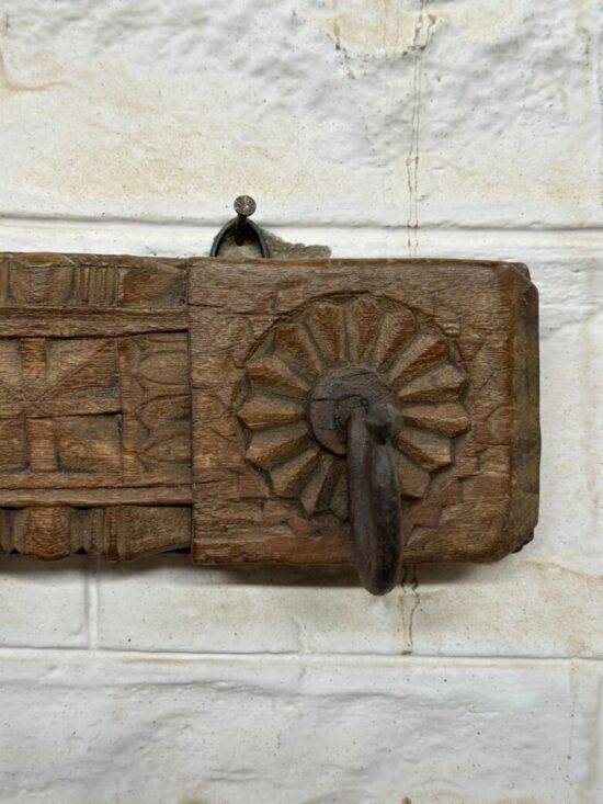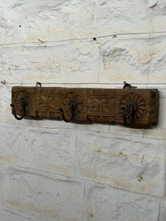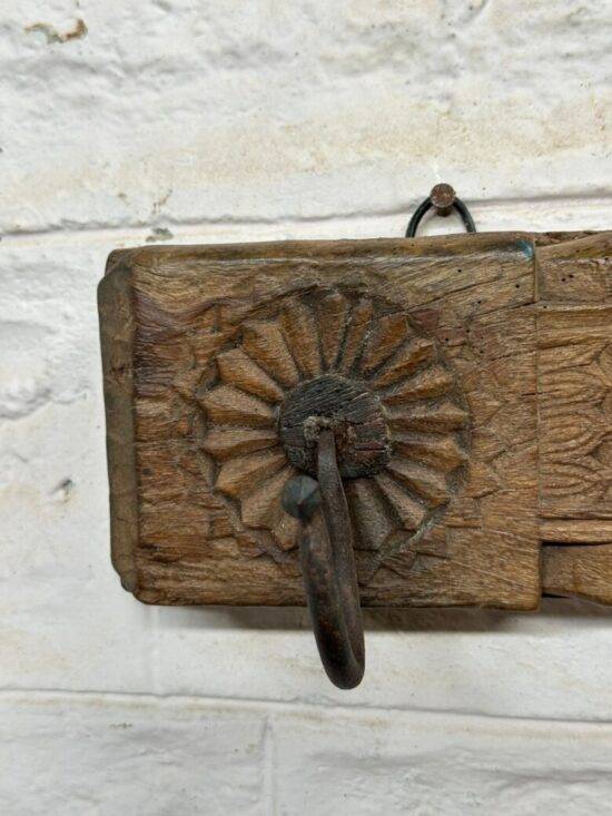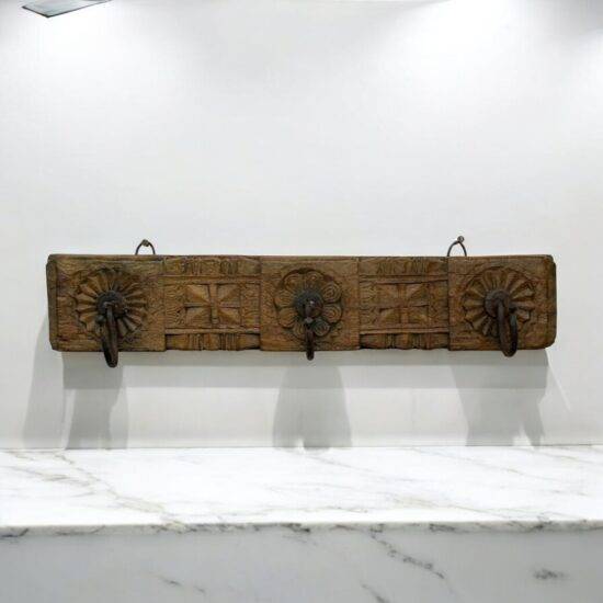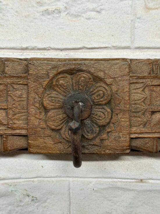 Add a touch of rustic elegance to your home with this antique wooden wall hook panel, hand-carved from solid teak and adorned with three iron hooks. This piece features sunburst floral carvings and geometric patterns, reflecting the intricate craftsmanship of traditional Indian artisans.