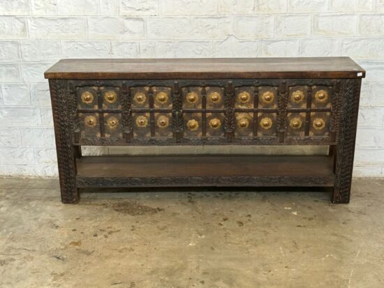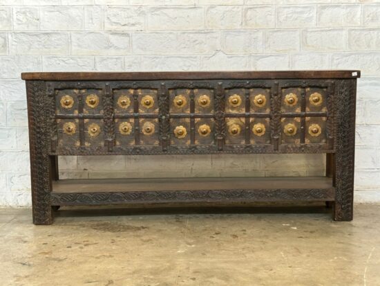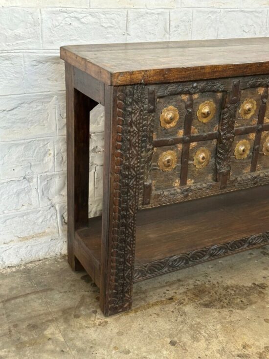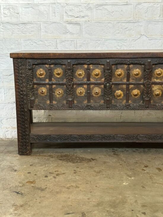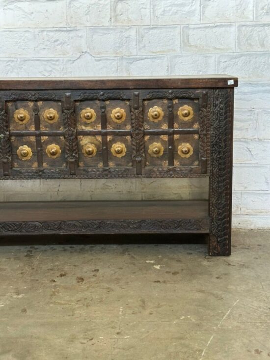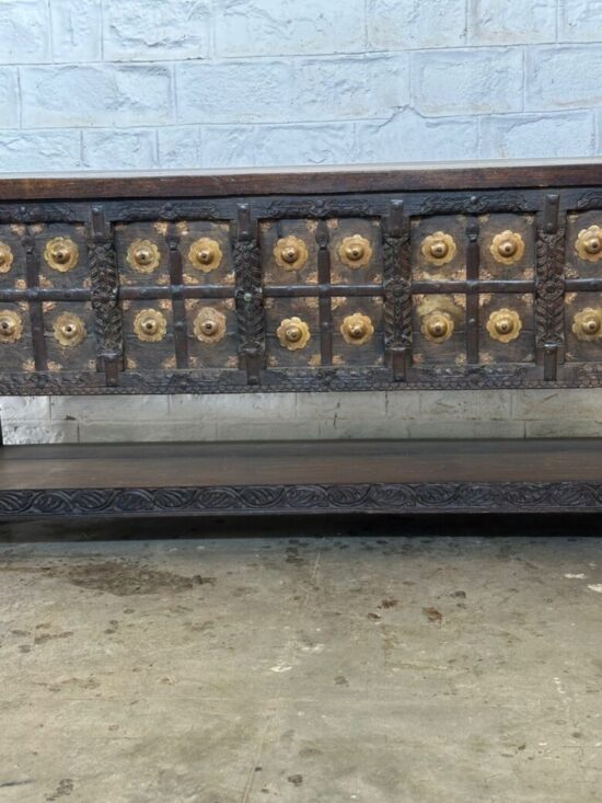 Made from solid carved wood with brass paneling and decorative rivets