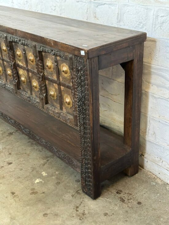 Bring timeless elegance to your home with this Vintage Carved Wooden and Brass Console Table, a rare Indian antique dating back to the 1910s.
