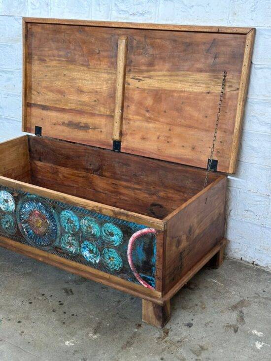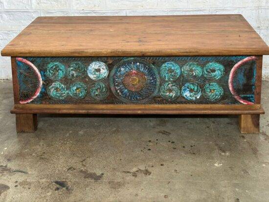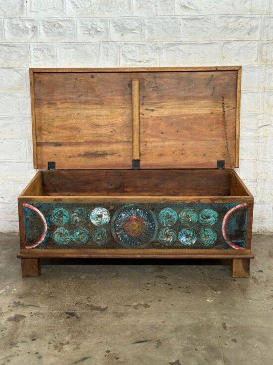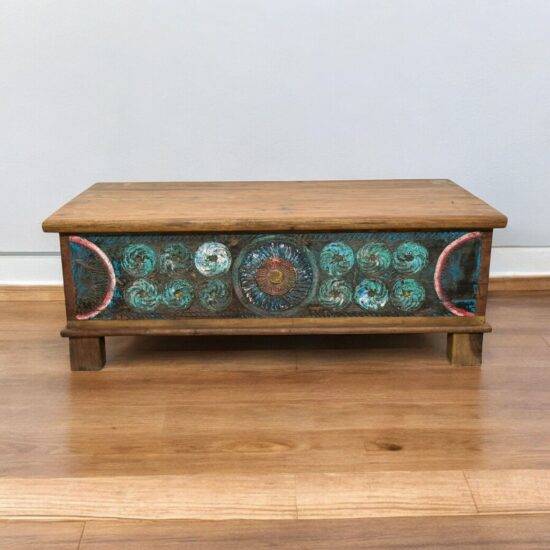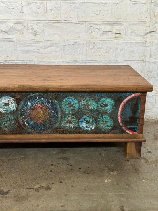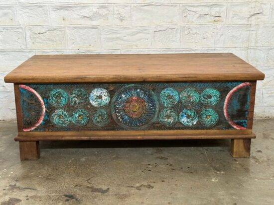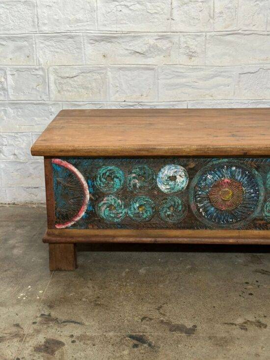 Add a touch of bohemian artistry and functionality to your living space with this stunning handcrafted vintage Indian trunk, made from solid teak wood and featuring beautifully carved and hand-painted tribal motifs.