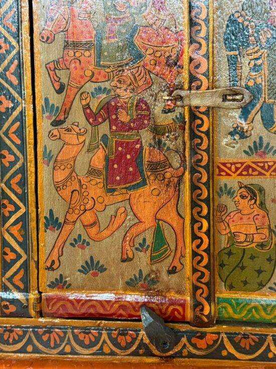 This stunning vintage Indian window panel is an authentic example of hand-painted folk art on solid teak wood, originating from India. Featuring beautifully detailed elephants, cows, and horses, the artwork reflects traditional Indian symbolism of strength, prosperity, and protection.