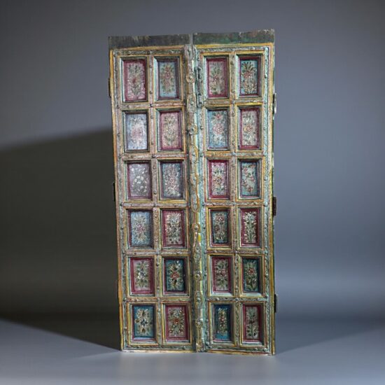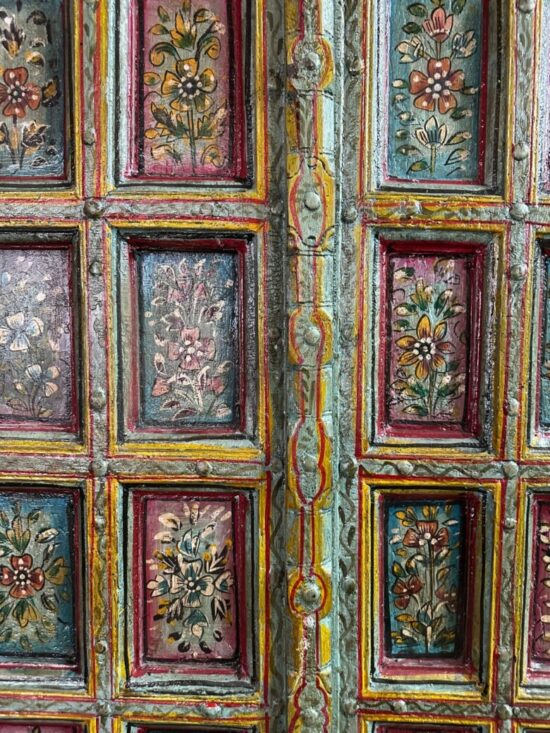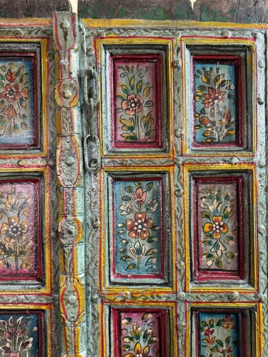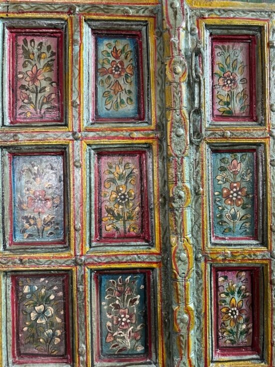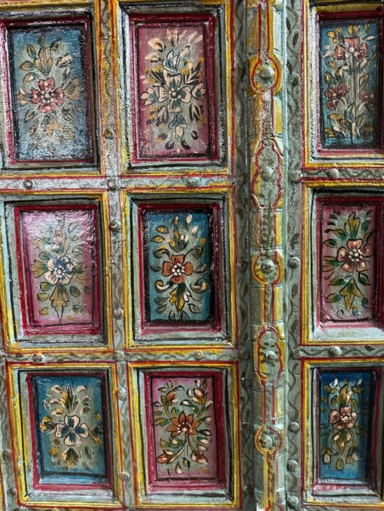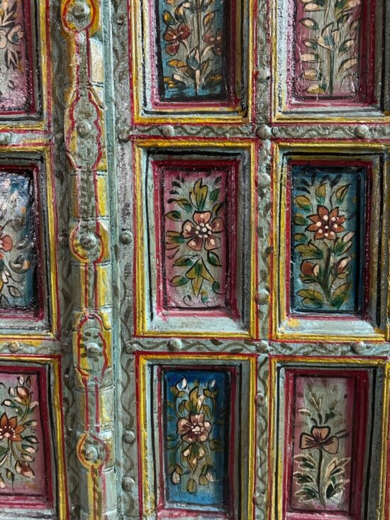 Each panel is meticulously hand-painted in Mughal floral motifs, featuring rich tones of blue, red, and gold that highlight its architectural charm. The natural distressed patina tells the story of its age and adds to its authenticity, making it far more than just a decorative piece—it is a slice of Indian heritage.
