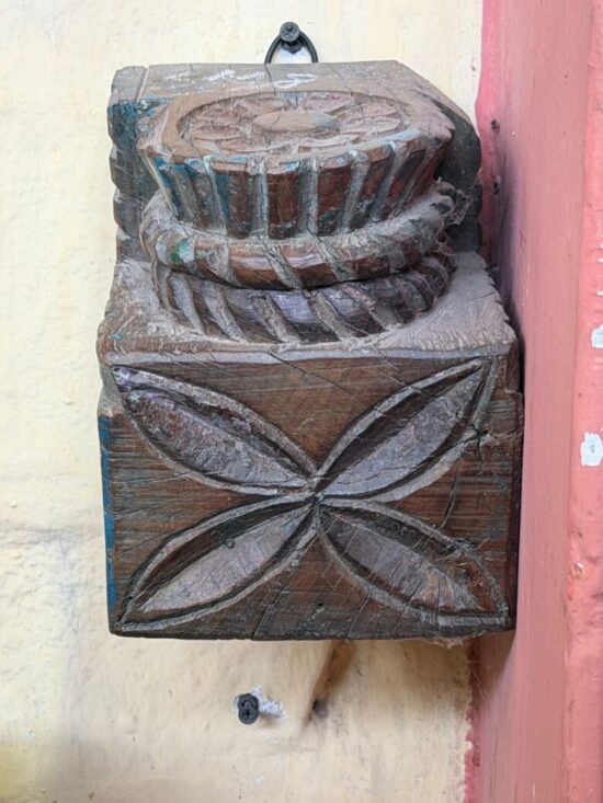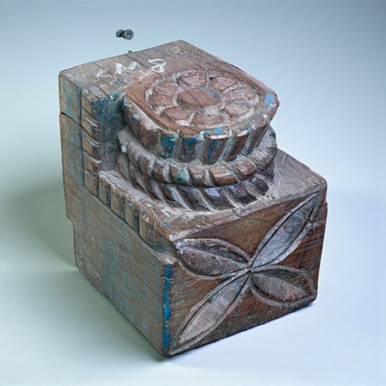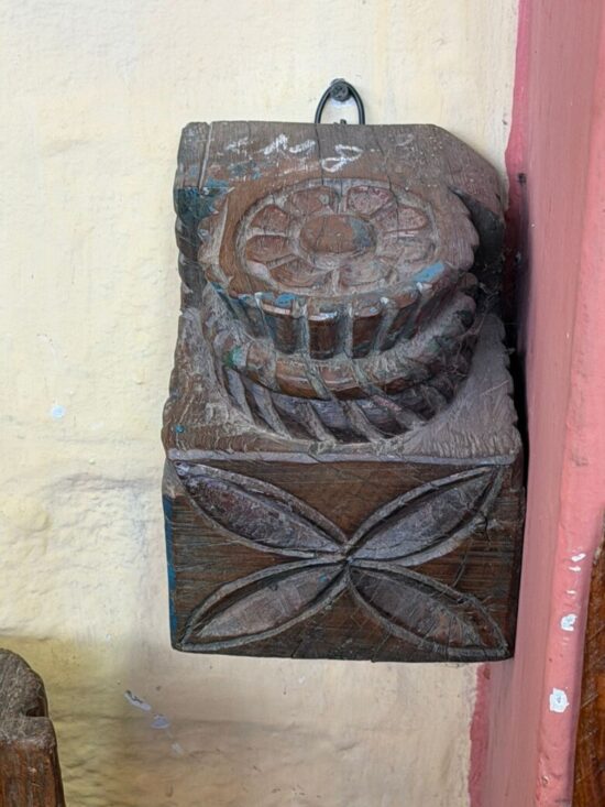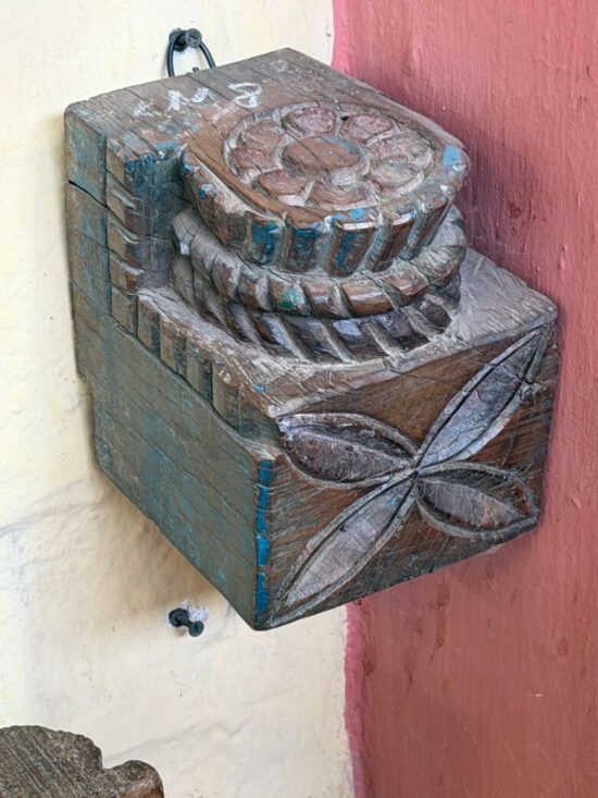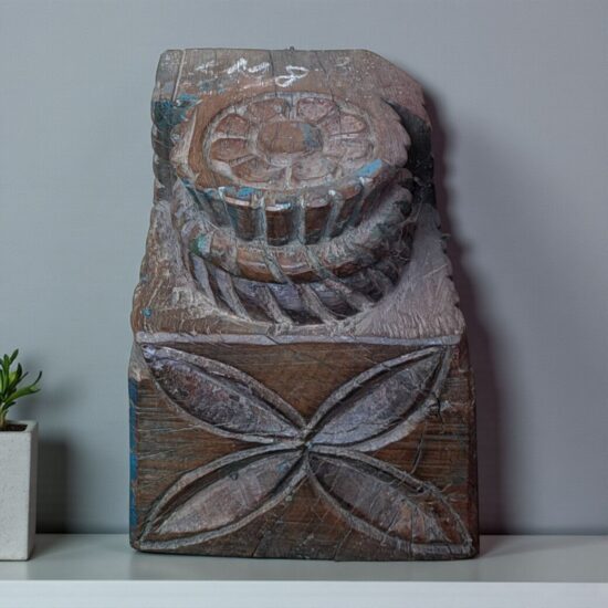 This Vintage Corbel Shelf is a striking piece of traditional Indian craftsmanship, showcasing intricate floral carvings and traces of its original blue paint. Dating back 80–90 years, it was once part of an old Indian haveli (mansion), serving as an architectural corbel that supported beams or balconies.