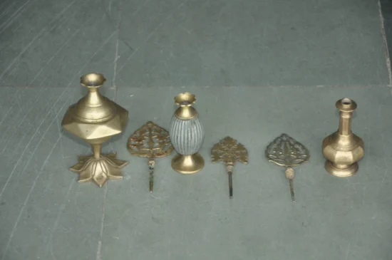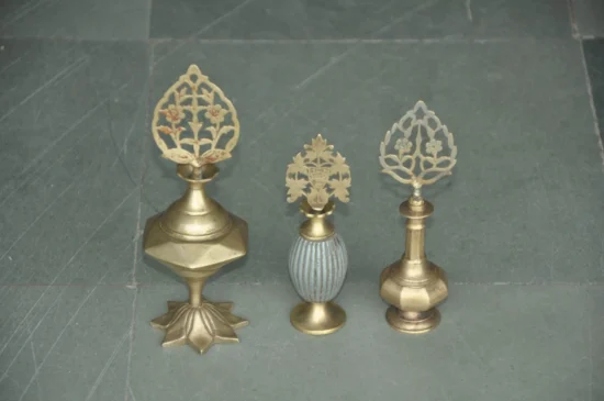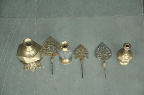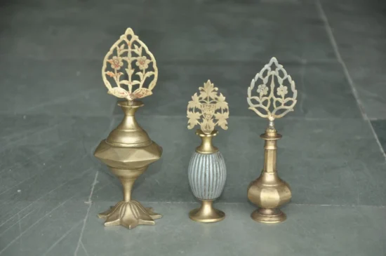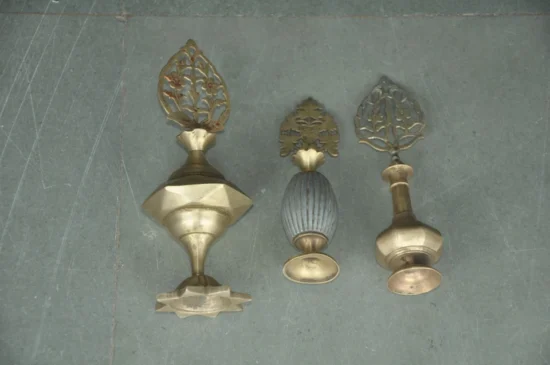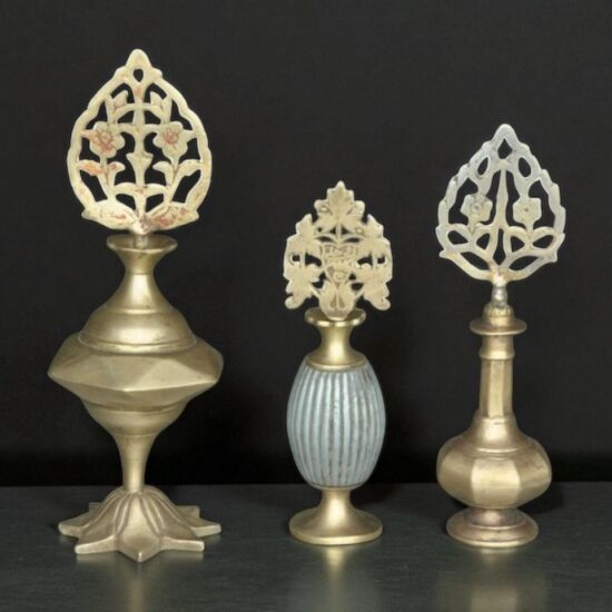 This rare set of 3 vintage brass black eye powder bottles dates back 60–70 years, showcasing the intricate artistry of traditional Indian metalwork. Each bottle features a unique design with finely crafted cutwork lids and elegant shapes, making them both functional and decorative.