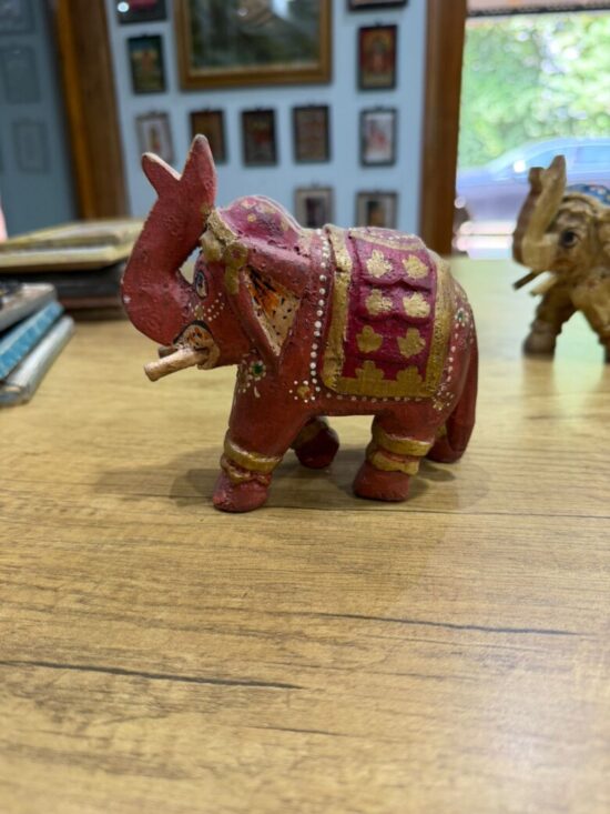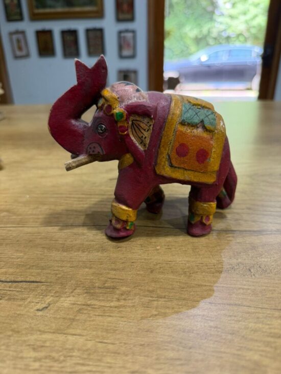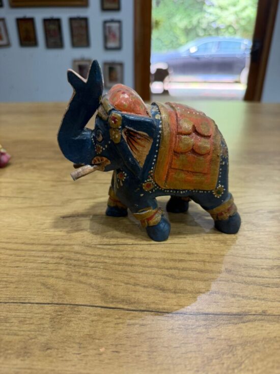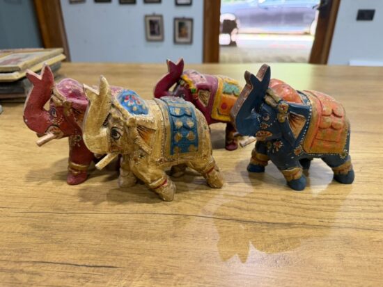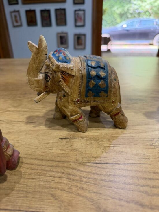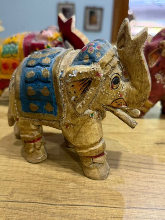 The elephants feature intricate detailing, with ornate saddles and embellishments in red, blue, gold, and maroon tones. Symbolizing wisdom, strength, and good fortune, they make a beautiful addition to your home decor, shelf styling, or festive displays.