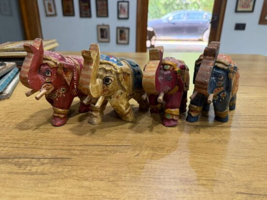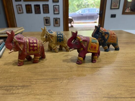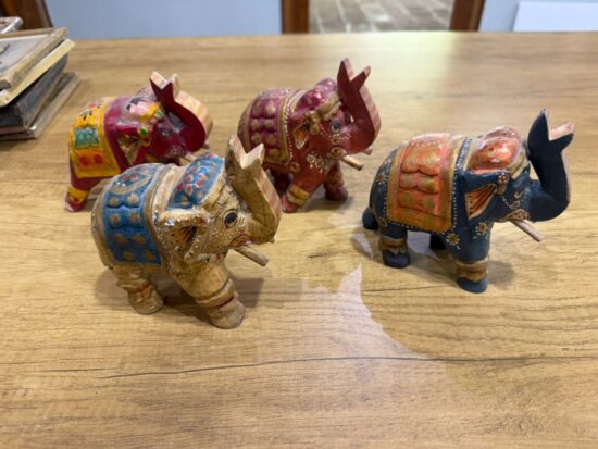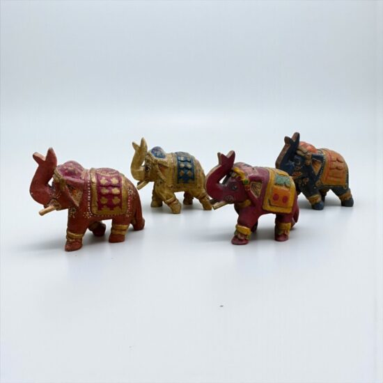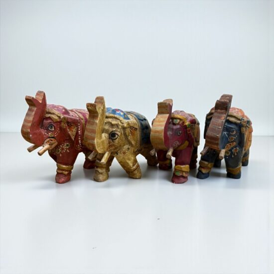 Add a touch of heritage and color to your space with this set of 4 vintage hand-painted wooden elephant figurines, crafted in India. Each piece is meticulously hand-carved and painted by artisans, showcasing traditional Indian motifs and vibrant hues.